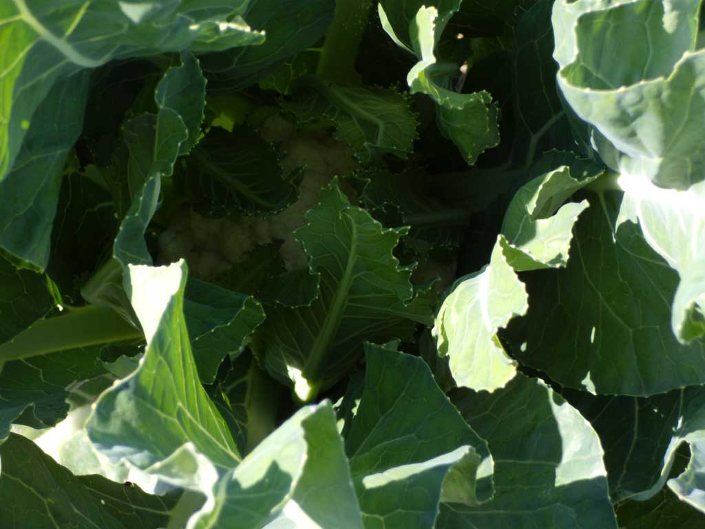 Our cauliflower variety, Amazing, is one I've used for several years, as it self-blanches pretty well. I did have to throw away one head and plant where the leaves simply didn't wrap around the head to protect and blanch it. In the past, folks tied cauliflower leaves up with string to keep the heads white and sweet. The shot at right shows how the leaves protect the growing cauliflower. Note that I lightened the head a bit in Photoshop so it would stand out a bit more.