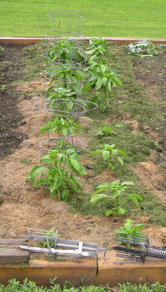 Using fresh grass clippings can burn or even kill tender garden plants. Even though I'd let the grass clippings lie for over 24 hours before using them, they were still warm to the touch last evening when I finished up adding mulch to our softbed. I was careful not to get too heavy a layer around our tender, young carrot crop, but really put a heavy layer around our hardy onions. I also had to renew the mulch layer around our crop of pepper plants.