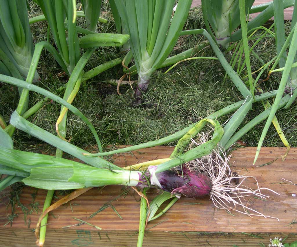 Our Walla Walla and Red Zeppelin sweet onions are just beginning to bulb now. Since I planted them in a fairly close pattern, we are already pulling some of them for kitchen use and to free up enough space for the others to fully bulb.