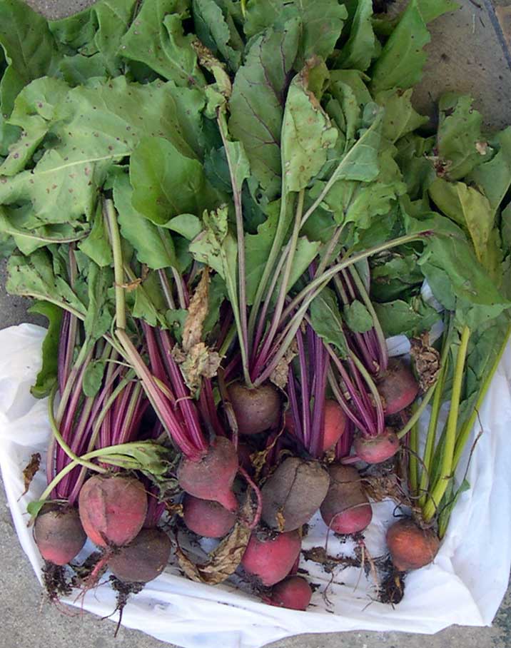 I pulled a few beets yesterday. I'd planted just a few beets but used three varieties in the planting: Burpee's Golden; Red Ace; and a novelty variety from the Seed Savers Exchange, Chioggia. The Chioggia variety is supposed to have well defined red and white zones in it, but ours just had a bit of red striping. I'd guess that they need to get a bit larger for the color to develop, but I like to pick my beets fairly small.