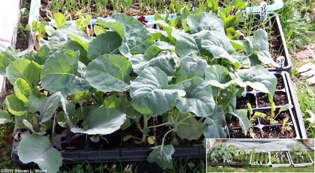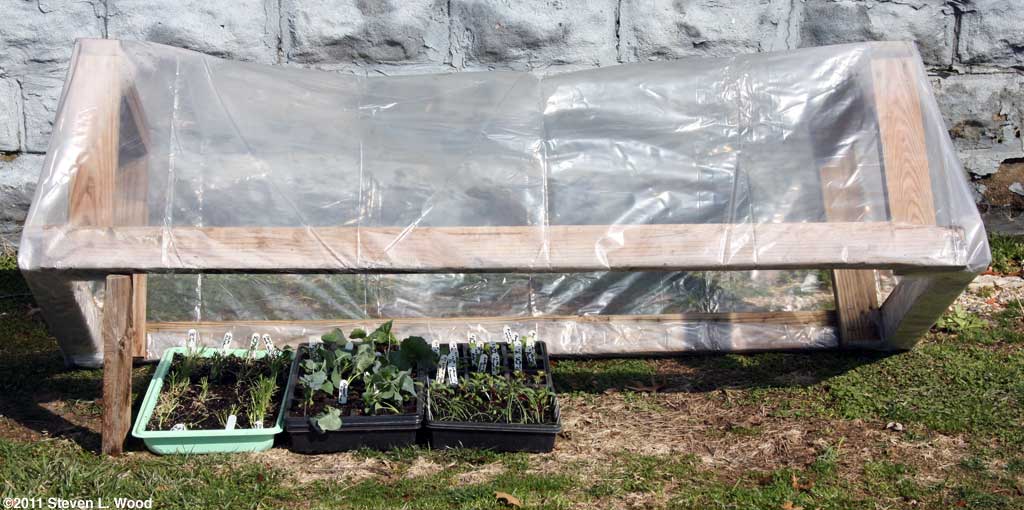 After several tries over several days while standing, I finally just got down on my belly today to get a good shot of our garlic. Most directions for growing garlic suggest pulling back the mulch used to cover ones garlic bed over the winter, but our garlic just pushed right through the old grass clippings. We planted a little over one 15' row with elephant garlic last November. The rest is German garlic. While I haven't tried it, I read that one can still plant garlic cloves in the early spring. They won't produce a full bulb, but are said to produce a very large, round clove of garlic by fall. Obviously, if you live in a similar growing zone as we do, there's still plenty of time to get many transplants started at home for your garden. Tomatoes, peppers, melons, cucumbers, squash, and many other veggies can be started in the next week or so and be just about the right size for transplanting in May. Thursday, March 24, 2011 - Winter Returns After a week or so of unseasonably warm temperatures, weather cold enough to possibly harm plants under our cold frame is now expected. We've had highs in the 70's for several days, but have a prediction for an overnight low tonight of 23o F! I began the process of bringing in plants from our back porch yesterday and will bring in all but our brassicas and onions from under the cold frame late this afternoon.