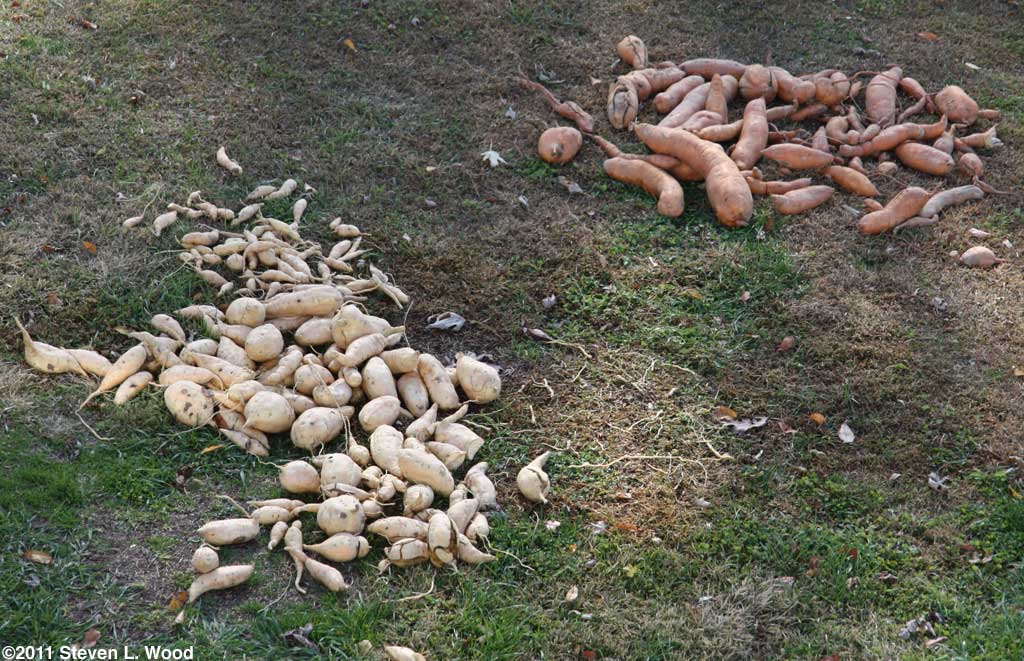 The last of the sweet potatoes I dug were of the Nancy Hall variety, shown in the foreground of the photo at left. They have a much lighter skin and flesh than the Centennial sweet potatoes shown further back. Both varieties produced an excellent crop of tubers, with me hauling well over a hundred pounds of sweet potatoes to our basement storage area.
