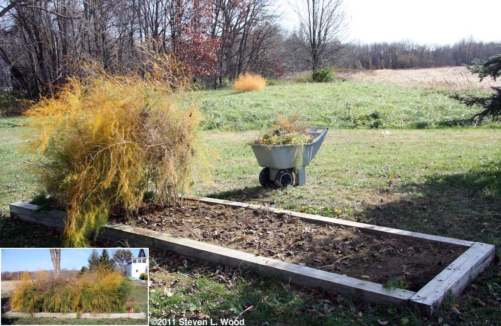 I initially set the mower deck at its highest setting and mowed a path into the area and around the asparagus patch, only clogging the chute and killing the engine once. After that, I was able to mow down the asparagus, lower the deck a bit, and get a pretty clean cutting of the area without scalping the asparagus ground. When done mowing, the area got a heavy dose of 11-23-20 and lime. We may never harvest any asparagus spears from this "new" patch, but we've enjoyed the contrast of its golden foliage against the green grass around it each fall for years. With a little care, it may continue to grow well into the future.