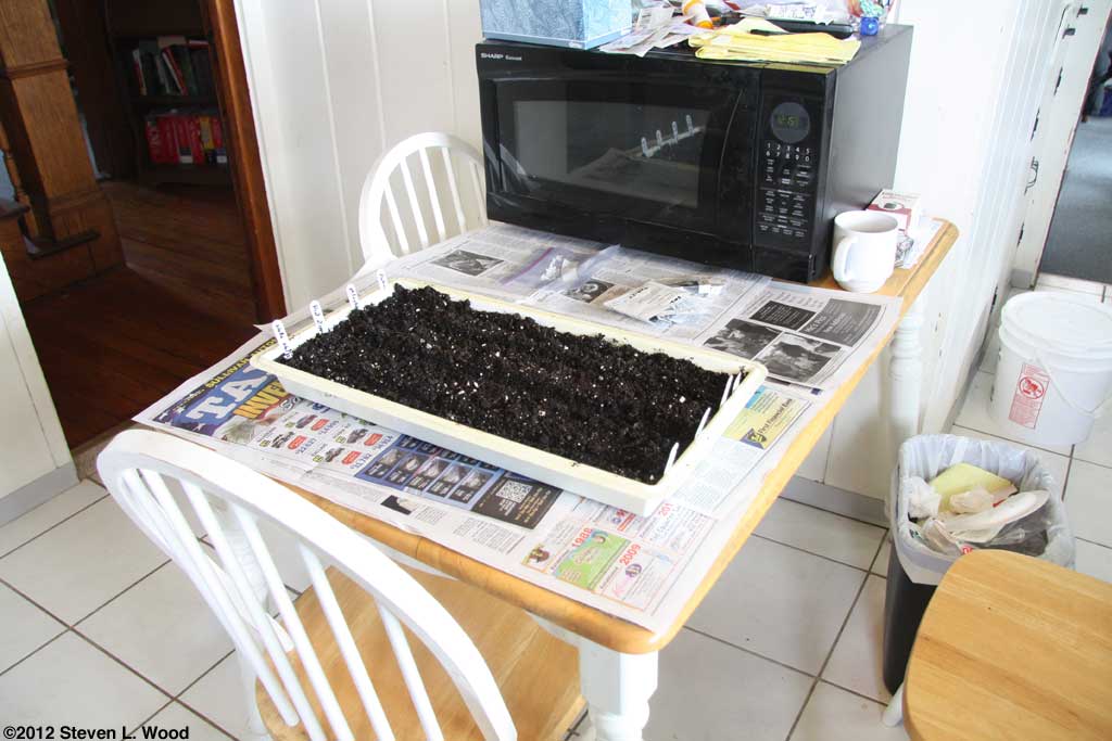 Before starting to plant, I get my labels made and water the flat with warm, non-softened water. I'm pretty liberal in my use of plastic plant labels, as I wash and bleach them each winter so I can reuse them. Once the flat is watered, I begin inserting the labels and seeding the individual cells of the fourpacks.