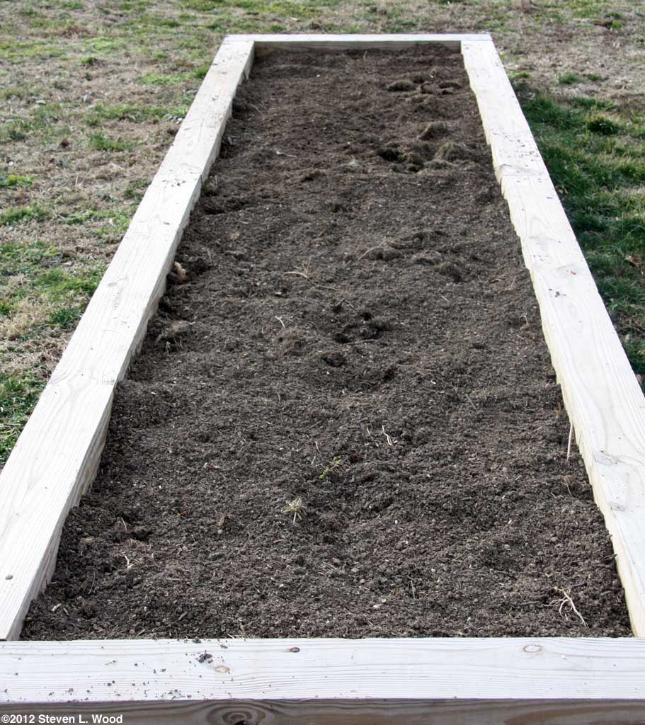 After covering the seed and tamping down the soil to ensure good seed contact with the surrounding soil, I used a couple of treated 4x4s to shore up the low side of the pea row. This area of our garden is soggy and usually has standing water during spring rains. I hope to keep this planting of peas a bit above the water with the timbers holding the soil in place. All four pea varieties planted today are tall, open pollinated varieties. I prefer to pick my peas standing up, as much as possible, and the taller varieties help with that. Since the peas are open pollinated, I could save seed if they bloom at different times. That probably won't be the case, and the peas will cross-pollinate as bees move from vine to vine. And at this point, I have no idea of the quality of three of the four varieties planted.