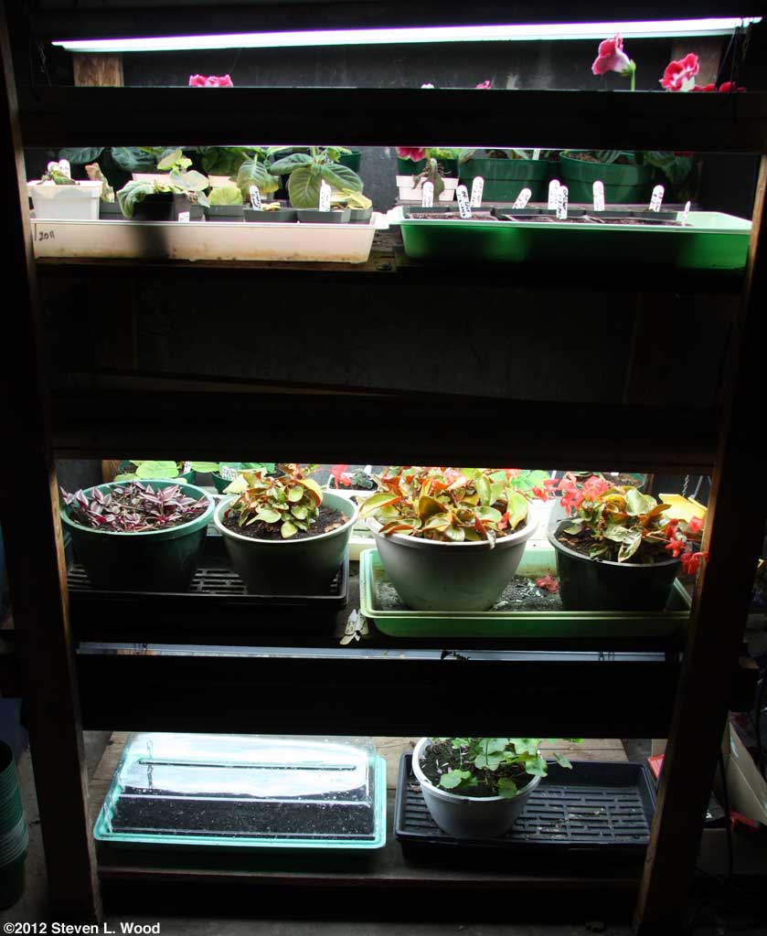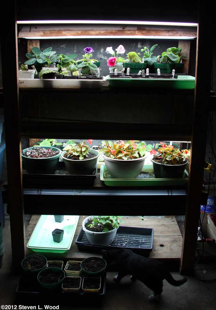 While cleaning up our plant room, which is nothing more than the old coal and wood room, I dumped out our bags of onions in storage one at a time. I found at least one onion with green sprouts on it in each bag and a few that had become soft and squishy that needed to be thrown out. Since I've kept up better so far this winter in checking our onions periodically, I didn't find any bags with lots of onions spoiling. I got around to checking the onions while cleaning the plant room. Onion skins, dust bunnies, and spilled potting soil all have to be swept up every now and then. The cleanup also afforded a good opportunity to organize leftover seed flats and inserts. When we get a warm sunny day, I need to take them outside and wash them. I also pulled a flat of dormant gloxinias out, watered it, and moved it close to the lights. The flat contained gloxinia plants that haven't broken dormancy after almost six months. While the corms are probably all dead, I thought I'd at least give them a bit of encouragement to sprout before pitching them. (And yes, that's our black, tuxedo cat hovering around the flat on the floor.) During these cold winter days, I'm at last able to find time to organize our gloxinia plants, moving all those that are in or near bloom to the top shelf. If I don't do that, I often miss a gloxinia that has come into full bloom, and we miss moving it to the kitchen where we can enjoy it each day. We currently have a couple of red, Empress gloxinias in bloom along with a white with pink dots open pollinated one, and a purple Double Brocade. All of the gloxinias on the back row of the top shelf are blooming or setting buds, so we should have a nice show later on this month and next. We also have two full flats, around 12-15 plants, in dormancy in cool, dark storage. Several other plants on the plant rack are heading towards dormancy. And our wax begonias, despite being cut back pretty severely last month, are blooming just a bit. Even our pot of trailing, ivy leaf geraniums has a bloom or two on it. Sadly, I just don't have a spot for them upstairs right now. And that reminds me that I need to get an order in to the Greenhouse Megastore for some new hanging baskets!