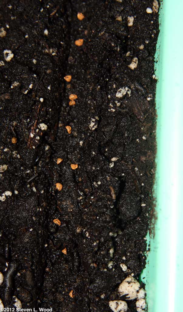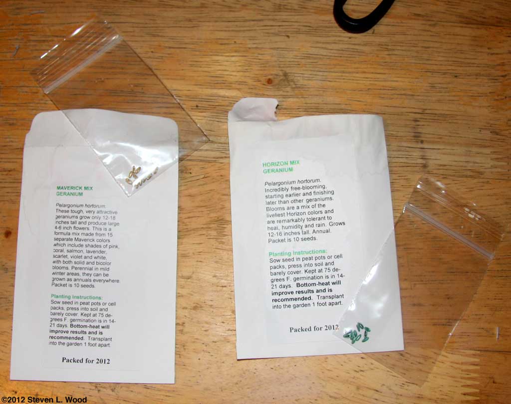 Why do some seeds germinate almost immediately and others from the same packet take almost two weeks? I read somewhere, but can't find the reference this morning, that improper handling of the seed during drying and storage can cause a hard seed coating that doesn't allow moisture to penetrate the seed to cause germination. And some seed varieties, definitely not geraniums, though, naturally have a thick, hard seed coating that must be scarified (scraped, sanded, frozen and thawed, etc.) before they will germinate. My best guess in this situation is that we simply got some bad seed from Swallowtail. The seeds in the packets almost certainly come from several plants and may have been processed at different times by whomever Swallowtail gets their seed from. The seed I dug this morning that had a sprout emerging may be the only other geranium I get from the planting. We'll see.
