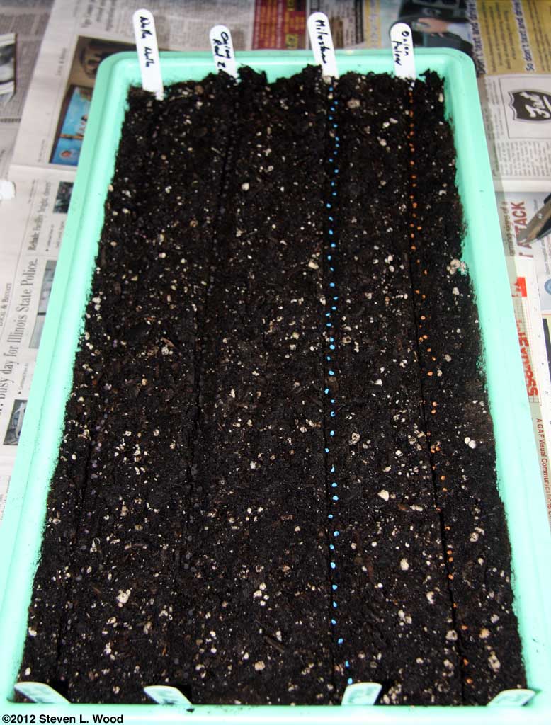 The potting mix I used this time was a half and half mix of screened compost from our compost pile and Baccto Lite Premium Potting Soil I water the tray of potting mix with hot water before going on, using water heated in a teapot that came from our cold water bypass of our water softener. I'm not sure if the salt in the softened water would hurt the onions, but I'd bet it wouldn't help them any. Once I get plant labels marked and inserted at the ends of the rows, I use a plastic ruler to make shallow furrows down the flat. I try to get the seed spaced about a half inch apart in the row, although I often end up with more, as the seed is generally small and easily overseeds as I pinch it out from between my thumb and forefinger. Note that seed treated with a brightly colored seed treatment is a whole lot easier to get seeded evenly. While the Pulsar seed shown at the far left was pretty big for onion seed, it quickly disappeared into the background of potting soil when viewed from any distance at all. The row of blue-green seed above is Milestone. All of our onion seed this year arrived as treated seed, but only the Milestone had the colorful, easy to see seed treatment.