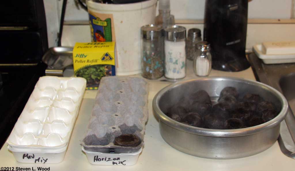 I also noticed that Twilley Seeds finally has their 2012 catalog online. They don't do web orders, though, still relying on phone and mail order only. Having gotten our first tray of onions seeded on Sunday, I've been having to hold myself back from starting a bunch of other stuff way too early. A couple of things got me to go ahead and start some geraniums today. I received an email from a reader last week, suggesting I try using peat pellets for our geranium plantings. Peat moss doesn't carry damping off fungus which has spoiled some of our geranium plantings in the past (due solely to my foolishness in using unsterilized soil). The writer said she had great success starting geraniums and other flowers in the compressed pellets that expand when soaked in warm water. I thanked her at the time and moved on, as I'd seen the price of pellet and tray starter kits, and found them a bit too expensive for my budget.