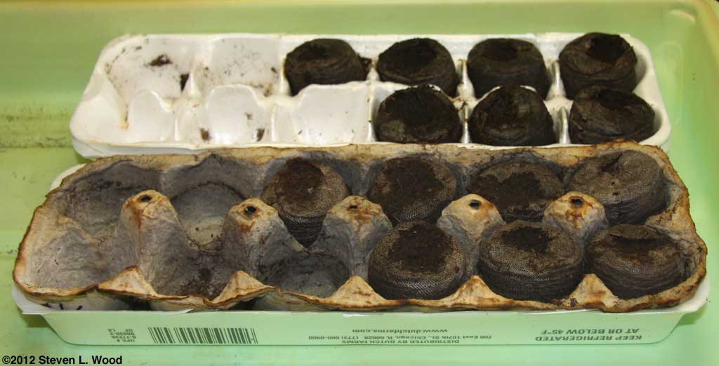 The second thing that got me going on starting geraniums was a leak around the attic window we had replaced in the fall, causing some water damage to our 2012 garden seed stored in our sunroom. While many of the seed packets are foil and won't be hurt by the leak, a few paper packets did show some moisture. They're now spread out on a towel in a warm location, drying. The two seed packets showing the most moisture damage were a couple of packets of geranium seed I'd ordered mainly to try out Swallowtail Garden Seeds. I decided to make the best of the situation by planting those seeds today, while also trying out the peat pellets and another old planting trick. I'd been saving egg cartons, both styrofoam and cardboard, to use for photos of windowsill gardening ideas. I still remember egg cartons filled with garden starts sitting in the windowsill at my grandparents' house.