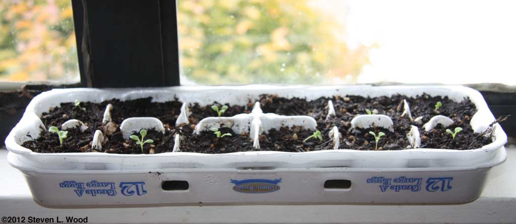 The closeup image below shows the petunia pellets resting on top of the potting mix. After carefully seeding each egg carton cell (and moving a few double seeds with tweezers), I tapped or squished each pellet down into the soil a bit. The pellets have to make good soil contact to absorb moisture so the pellet can melt, releasing the enclosed seed. I didn't order any new petunia seed this year, as we still had several fairly new packets left from last year. I could go broke ordering petunia seed, as the seed catalogs have an incredible variety of types and colors. I'll also be starting some Celebrity and Prime Time petunias in the weeks to come.