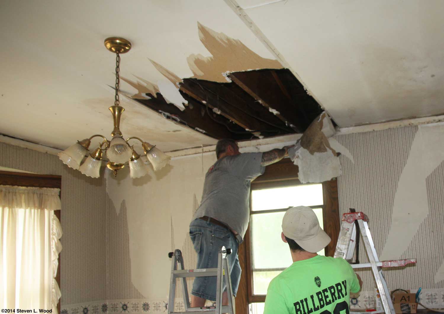 Our row of kale that was heavily picked in September has responded nicely to some fertilizer, compost, and nearly ideal weather. In a little less than a month, it has doubled the volume it had before its first picking. I'm not sure whether I better like looking at the deep green kale accented by a few flowers around it or eating it. We've pretty much put gardening on a back burner for the weekend, as we're getting a needed project started. A son-in-law is replacing our dining room ceiling which had some pretty serious water damage. The repairs had to wait until we replaced the roof last summer, so we've lived with plastic nailed to the ceiling of the dining room for some time.