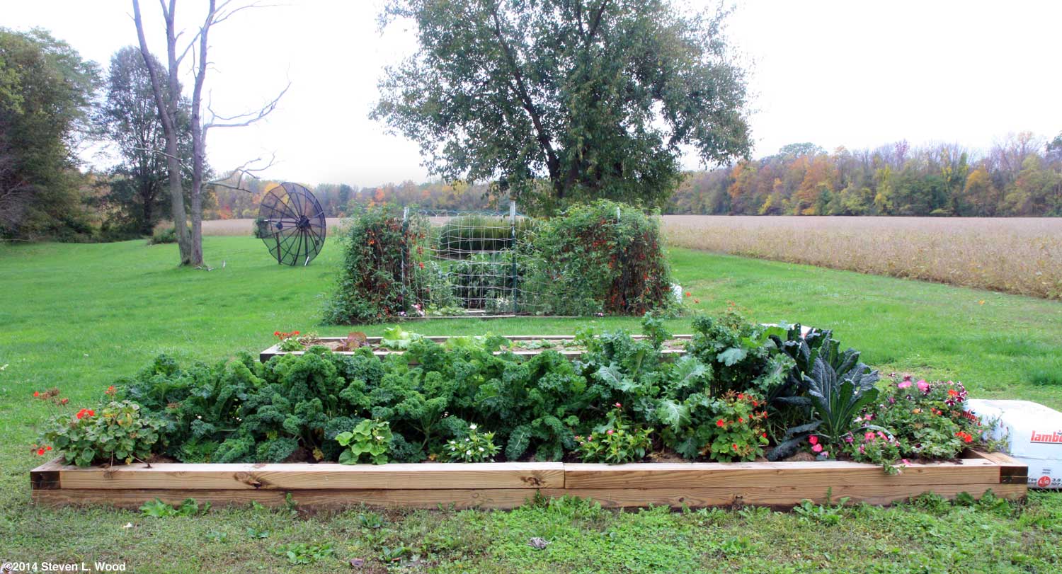 When I was balancing teaching with the weather and farming, I ended up picking soybeans one year in December. It wasn't much fun. With our large East Garden already put to bed for the winter, most of our gardening now centers on our main garden beds in the back yard. Viewed from either end, one can see that we have a good many crops still trying to produce at the very end of the season.