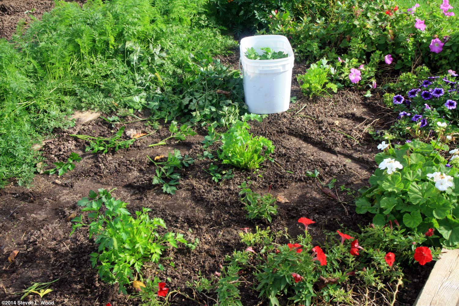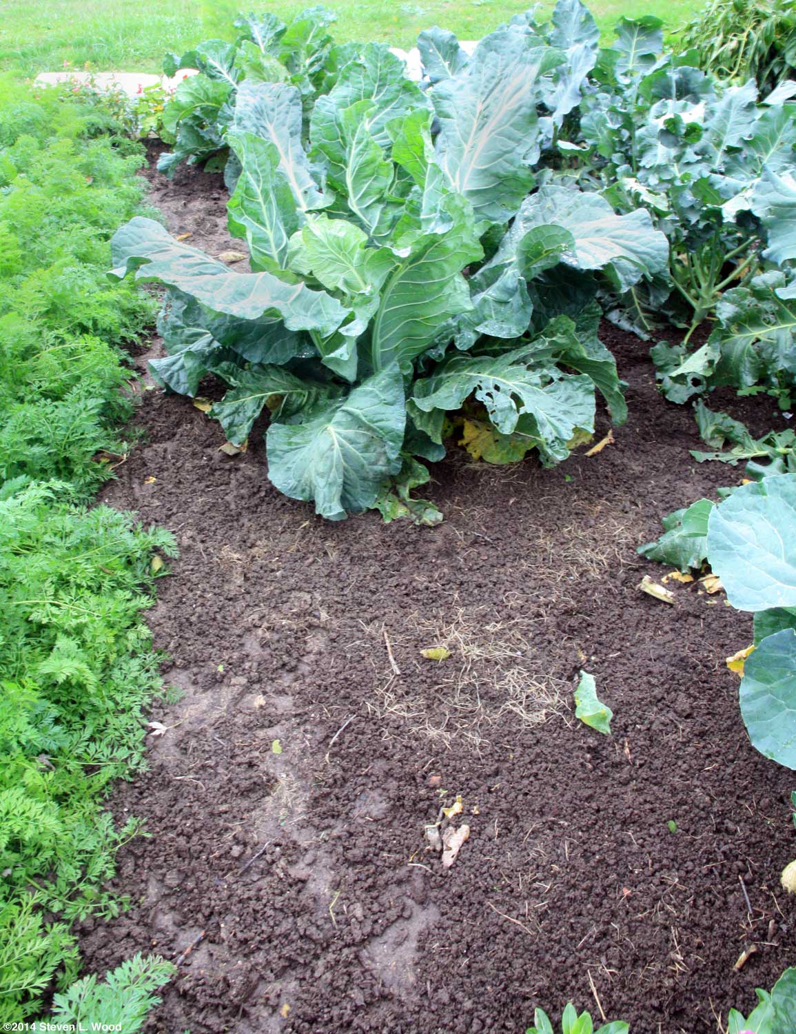 The carrots then got swished around in a bucket of cool water to remove some of the soil that stuck to them. I let them soak for a couple of minutes as I "dug" the next bunch of carrots. The bucket(s) of muddy water got emptied on our row of kale, putting the precious garden soil washed off the carrots back into another of our garden beds. At this point, I don't want to do anything to slow the drying of the soil in our main raised bed. When the carrots came out of the rinse bucket, they went into our garden cart. When I was done and the cart was nearly full of mostly 5-8" carrots, I pushed it to the house and filled it with water for another soaking of the carrots. If I can get the carrots clean enough with a second soaking and a bit of brushing when I trim the tops and sort them for storage, they may not need peeling when used. Let me ramble here a bit about our Ames Garden Cart Our garden cart is the four cubic foot model, although there's a three cubic foot model available that's a bit cheaper. Walmart has pretty good prices on them, although you might find a deal at the end of the season at a local hardware store. If they still make them as tough as ours was made, they're a real bargain. Getting back to gardening, our carrots were the last critical crop still growing in our main raised bed. There are a couple of cauliflower plants still trying to put on heads, and our five parsley plants have put on a bunch more leaves since we last harvested them. But we're at a point where everything can come out of the bed for a quick fall renovation. I'm pushing a bit on getting it done, as we have rain forecast for Tuesday, and I want the plot tilled before it rains. Monday, October 27, 2014 - Renovating Our Main Raised Bed