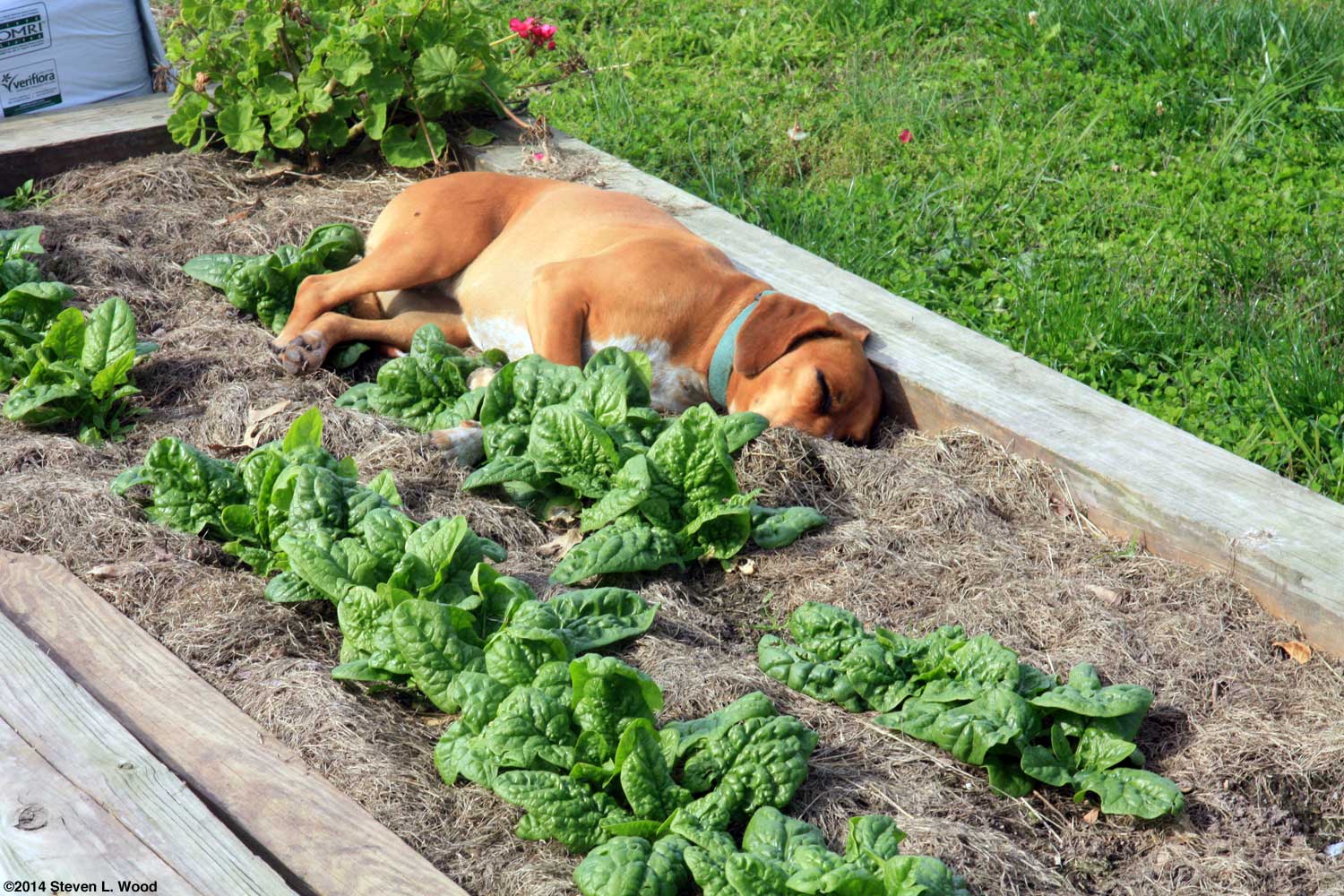 My game plan for the day had been to work a bit in the morning cleaning up the main raised bed and then mow the lawn in the afternoon. I spent several hours yesterday dropping the tiller attachment out from our lawn tractor and servicing and reinstalling the mower deck. It appears now, around 1 P.M., that the rather tall grass may not dry out enough to mow until late this afternoon. But if and when it dries out enough, I'll be ready with a mower with a clean deck with freshly sharpened blades. I've really been a bit slow in cleaning out the main raised bed, trying to decide whether or not to pull the flowers in and around the edge of the bed. The light frost this morning emphasized that our growing season is almost gone, so I went ahead and began pulling the flowers as I cleaned the bed. Left in the ground, some of the flowers would continue to bloom into November, but I really need to get this bed tilled in what appears to be an extended dry period over the next week or so. And we still have flowers in bloom in our two narrow raised beds. While I was cleaning up part of our main raised garden bed yesterday, Daisy, our red beagle cross, made sure no one ran off with our spinach. She looked so comfortable, I didn't even scold her for getting in one of the narrow raised beds.
