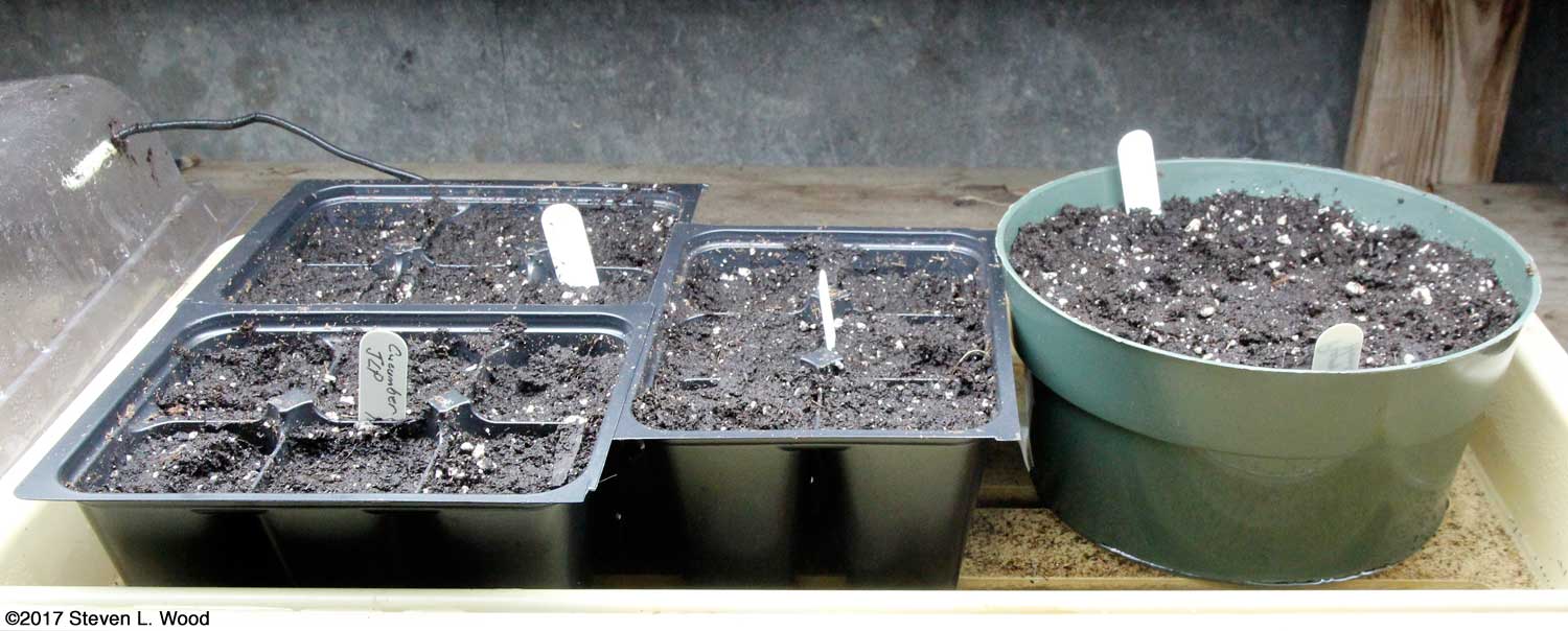 We were pretty worn out from traveling when we got home, but I revived a bit by the afternoon. I got in a little gardening by starting a bulb pan of pumpkins and several deep sixpack inserts of Japanese Long Pickling cucumbers. The Howden and Jack O' Lantern The Japanese Long Pickling cucumbers will go into our main raised bed once we get our early peas harvested and their vines pulled off the trellis. We have a lot of saved JLP seed on hand, so we'll probably focus more on pickle production this year than seed saving. Monday, May 8, 2017 - Transplanting Butternut Squash