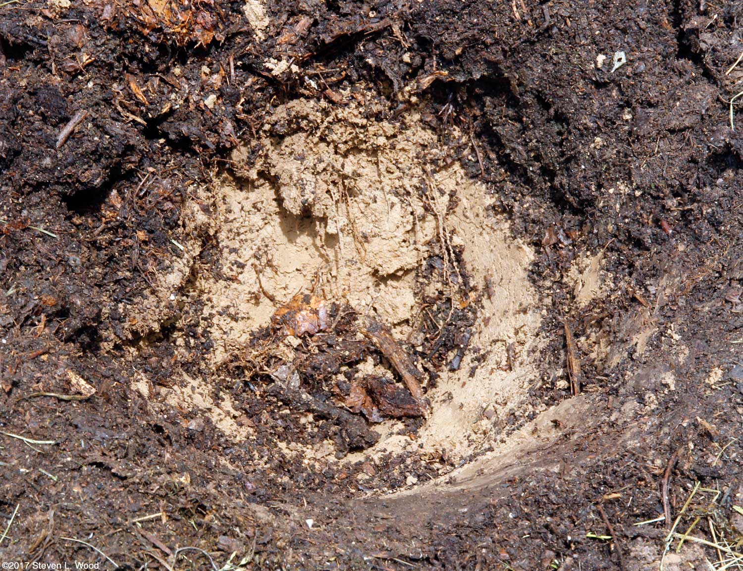 We grow our butternut squash and pumpkins outside our East Garden proper. Because both tend to overgrow anything around them, we plant them on the previous sites of compost piles in the field and mulch outward as they grow. While our pumpkins are now germinating over a heat mat in the basement, our butternut plants were ready to go into the ground today. The area for our butternuts had been covered with grass clipping mulch for several weeks to hold back weeds. To plant today, I pulled back the mulch, revealing what looks to be rich, black, composty soil. Digging down about a foot revealed what the soil in the field is really like, gray to orange clay. While the compost will help the butternuts, I prepare a deluxe hole for them by mixing some lime, fertilizer, and peat moss into the soil. Then I water with a starter solution of Quick Start After removing the plants from the bulb pan they germinated in, I pop them into the muddy goo, making sure there is soil contact all around the transplanted soil plug. Pulling mulch around the plants completes the planting. Because the area where the butternuts are is shaded in the early morning, I'll need to keep an eye out for powdery mildew, although Waltham Butternut Squash