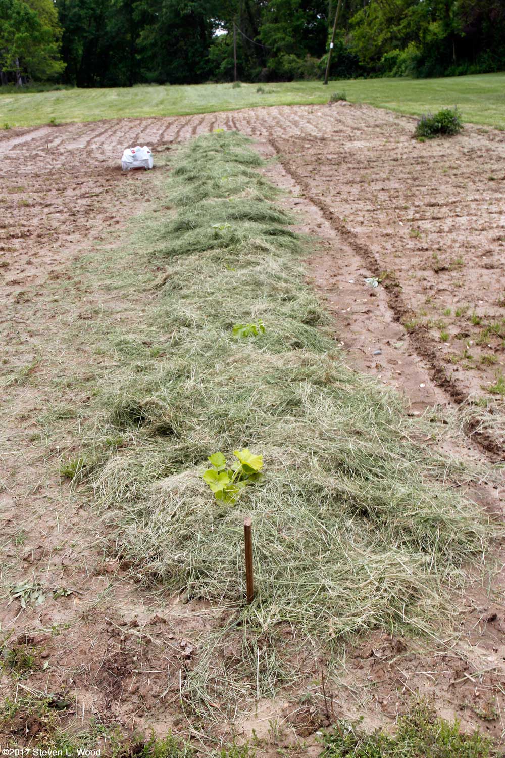 I transplanted the sweet potato plants into the row originally planted to Kennebec potatoes. All but one of the Kennebecs rotted in the wet soil, despite having been treated with captan! When I tilled the row and later when transplanting the sweet potatoes, I didn't find a trace of the Kennebec seed potatoes I'd previously planted. Unlike our usual potato culture, I mulched our sweet potatoes, a practice that has worked well for us in some years. Planting this late, however, puts us into harvesting in late August or early September. We often have a mini-drought through much of July and August. The sweet potatoes just quit putting on size during those times. Unfortunately, when adequate rain returns, the sweet potatoes grow so fast that they often split down the side, yielding good sweet potatoes that don't store as well as unsplit sweet potatoes. Since I was mulching the row, I went ahead and mulched the one Kennebec plant that survived the rain and resultant soggy soil that took all its siblings. Almost Done