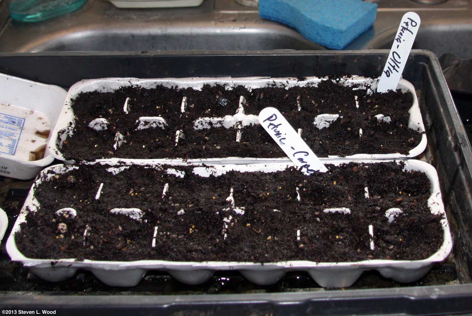 With seed orders mostly in, there's always a great temptation to get lots of stuff started in January. But for most of what we grow, it's still a bit too early. I messed up and didn't get our parsley seeded in January, which I should have done. But I did start our geraniums (1, 2) and onions. Both would prove to be troubled plantings. One thing I did rush was starting petunias in egg cartons in late December. By mid-January, one egg carton of petunias was keeping company on our kitchen windowsill with an old parsley plant that never got set out in 2012. It's funny how one begins to crave seeing something green and growing in the dead of winter. |