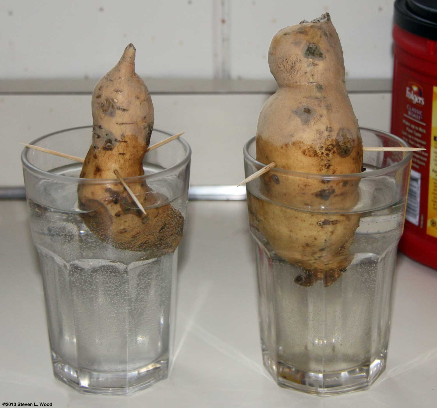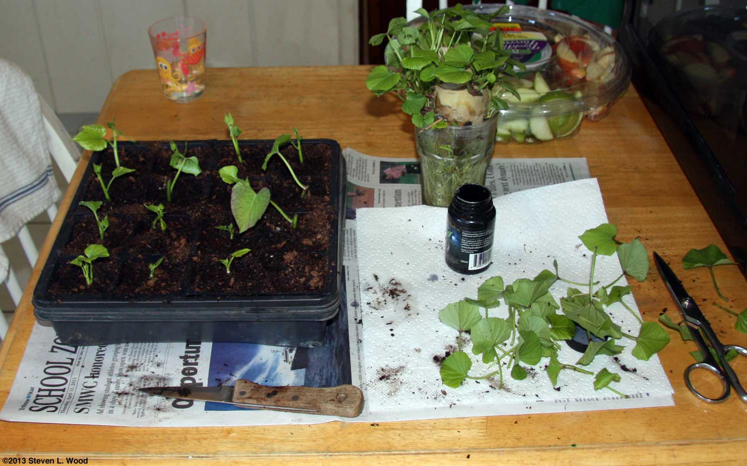 During a few cool, wet days, I turned my attention to indoor chores such as caring for our transplants under our plant lights and getting some sweet potato slips rooting in potting soil. Our windowsill sweet potato was almost too pretty to trim, but it produced more than enough sweet potato plants for our garden.