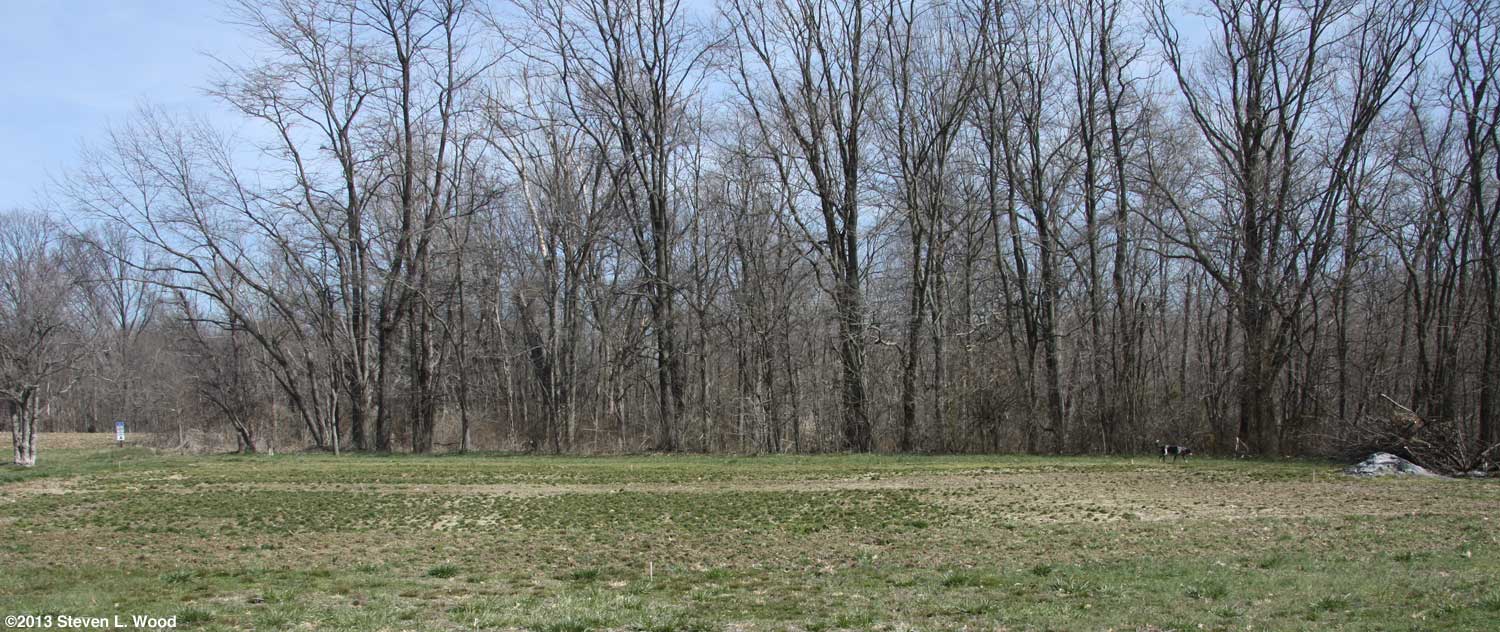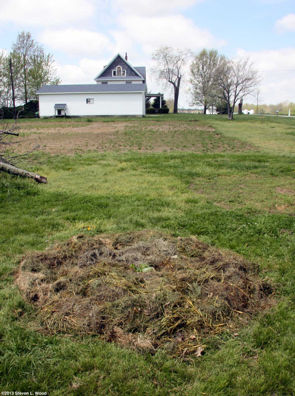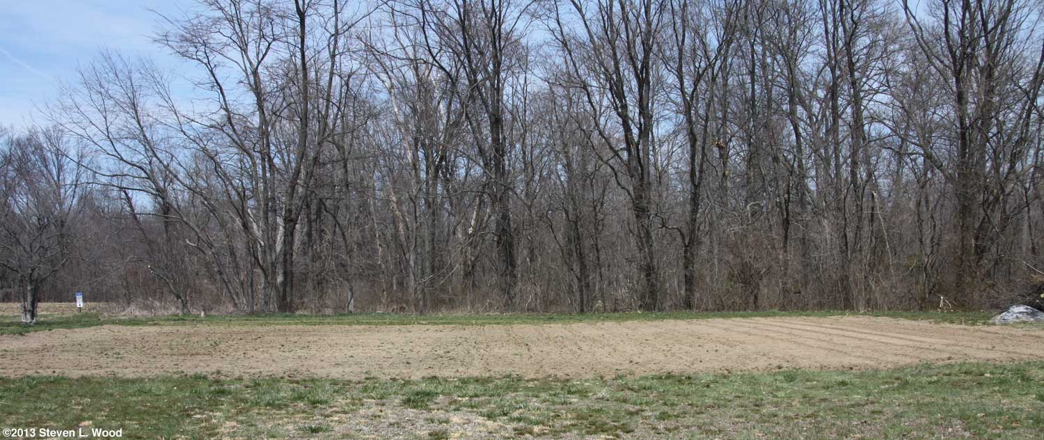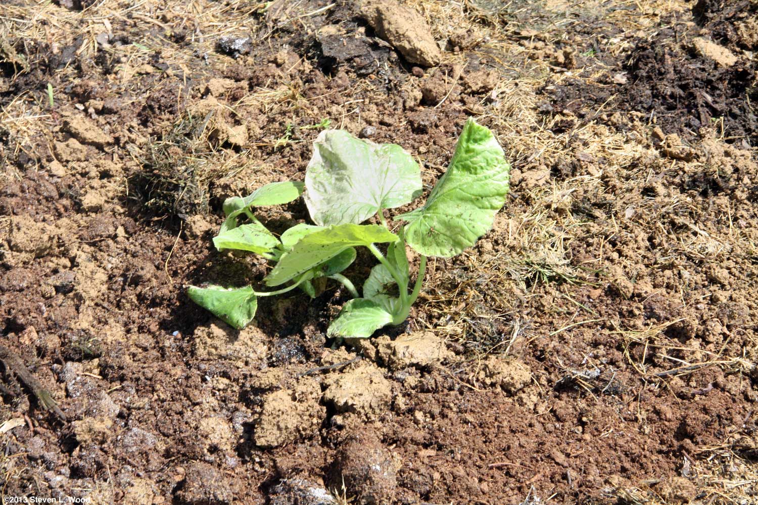After firming up the soil around the butternuts, I laid a heavily circle of grass clipping mulch around the hill of butternuts, being careful not to get the decomposing mulch up against the stems of the transplants. I also sprinkled a bit of Shot-Gun Animal Repellent to keep deer from nibbling on the mulch (and smashing the tender, young plants). The repellent also discourages our dogs from napping on the mulch, one of their favorite tricks. As the butternuts grew, I expanded the circle of mulch. The shot at right shows how far from the East Garden and house the new planting is. That puts it very close to the woods which shaded it some in the mornings. Beyond cutting the plants' growth, vining crops in the shade tend to get powdery mildew far easier than crops grown in full sunlight. And close proximity to the woods can frequently lead to critter problems. Deer and raccoons are our primary pests, although we also have our share of possums and skunks. We've not had butternuts bothered by critters in the past, but there's always a first time.