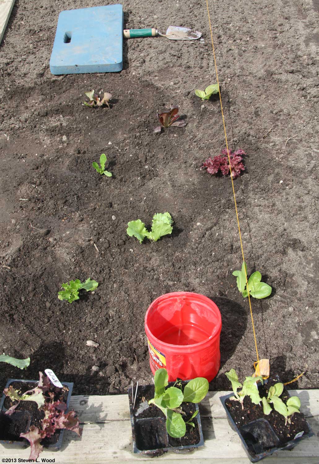 Our peas planted in early March were tall enough by April 12 to add the trellis they needed for support. We squeezed Amish Snap, Champion of England, Mr. Big, and a bit of Spanish Skyscraper into about a twelve foot long row. Our transplanting continued with our rather sad looking onion transplants going in on April 13. We also seeded carrots and transplanted some celery and leeks into a tight, intensive planting at one end of our main raised bed. I like to grow our onions and carrots at the edge of our beds, as one can easily cultivate, weed, and mulch from the side without ever having to step into the bed. The next day our lettuce went into an area next to the onions and carrots. I like to just mix our lettuce varieties, trying to make a pretty mix of the reds, greens, and mixed shades of color of the various lettuce varieties.