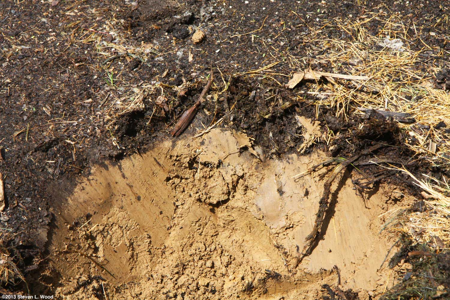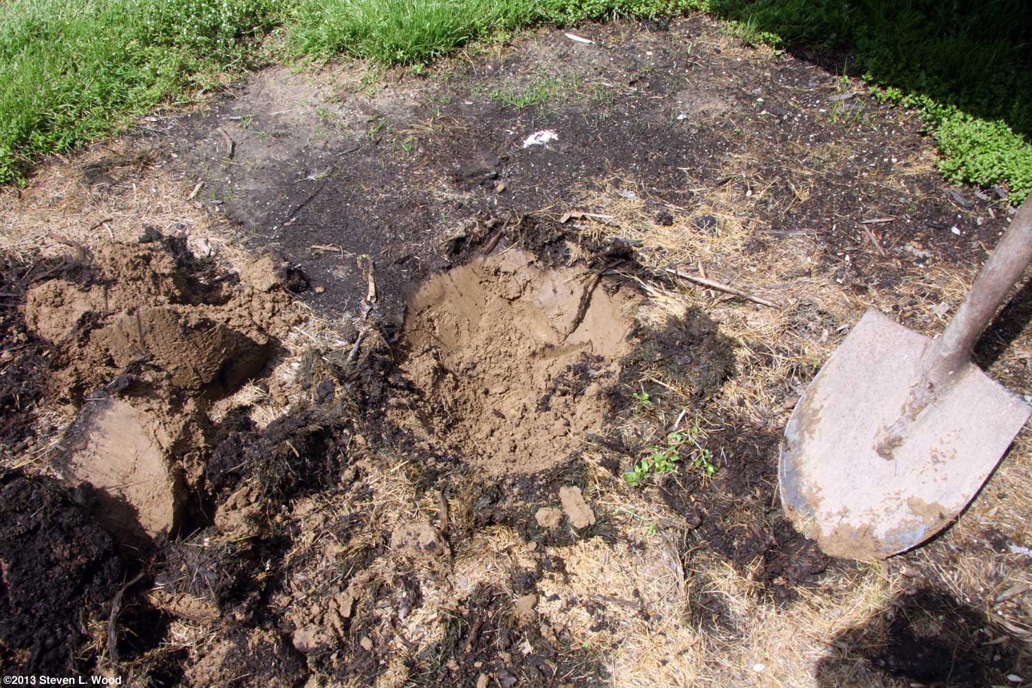 The site for the butternuts was fairly clear other than some residue from the compost pile that had been there up until last fall and a few weeds. I dug a hole around a foot deep, and then used my shovel to loosen the soil at the bottom of the hole another six inches or so down. I'm always amazed at the very thin layer of new topsoil created by the previous compost pile. I also was a bit dismayed that I hadn't raked the area better the previous fall, as there were still some decomposing vines left that could transfer plant disease to the butternuts.