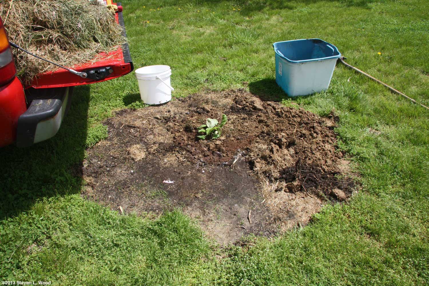 I'd done an emergency replacement of the well pump three years ago. I had to go with a brand-x pump at the time, as that was all that Lowe's stocked! To make matters worse, the previous pump had burnt out when I forgot I was watering what probably was the world's most expensive planting of green beans ever. The well ran dry and the old pump burnt itself up pumping sand and air. Knowing that I'd been taken on a cheapie pump that wouldn't last, I had the foresight to order a good one Sadly, despite my foresight in ordering a backup pump and my incredible plumbing skills (Can you hear the hilarious laughter coming from my family?), mother nature decided we needed lots more rain. Our usually dry raised beds had standing water in them, not doing the crops already planted any good. And we live on high ground. Folks in lower lying areas were in a real mess. We ended the month with almost nine inches of rainfall. Transplanting Butternuts Our garden plots remained too wet to do anything for the rest of the month. I did, however, get to plant a hill of butternut squash just outside our East Garden. Butternuts have been banned from our main gardens due to them totally overgrowing and crowding out our melons in the past. Now, I plant our butternuts outside our East Garden, usually on the site of the previous year's compost pile, which seems to give them a bit of a boost.