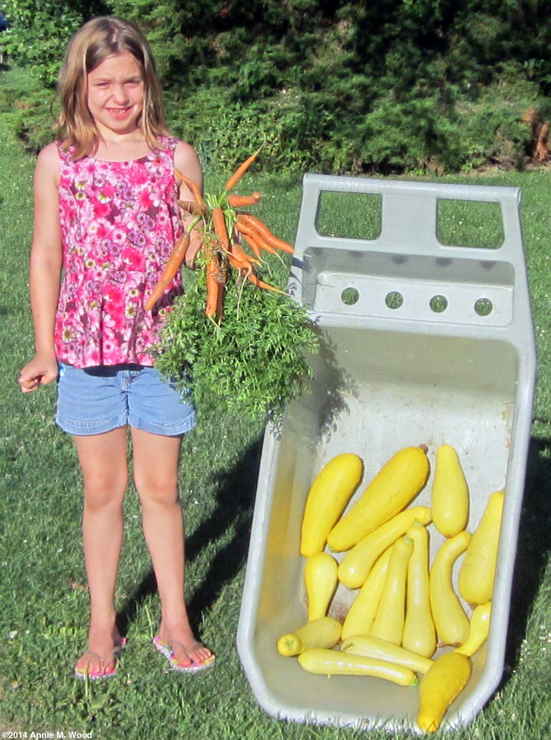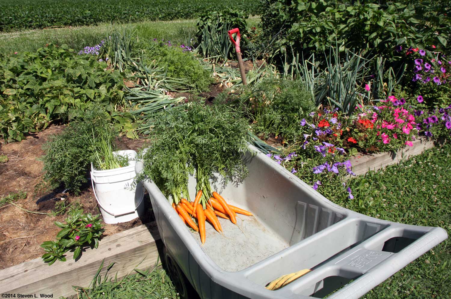 By July 15, I was finally able to do a half day of real gardening. Since our carrot rows ran between rows of rapidly toppling over onions, they needed to come out first so that the onions would have space and sunlight to cure a bit. A big surprise awaited me at the very end of our double row of carrots. I'd planted just a few feet of a highly recommended new hybrid carrot variety, Sugarsnax. Fedco raved about the carrot variety in their description (What seed house describes anything they're selling as average?) with tons of superlatives about the long, thin carrots. When I began to dig the Sugarsnax, I found that I was in for a real job. I normally just push my heavy garden fork deeply into the soil beside a carrot row and lift a bit. That usually loosens the soil enough that I can lift the carrots out of the ground by their tops without breaking the roots. With the Sugarsnax, one measuring almost fifteen inches long, I had to really dig deep to extract the carrots without snapping them off. After rinsing and thoroughly washing the carrots for storage in our refrigerator, our haul of carrots weighed in at sixteen pounds! And when I was done, it was obvious that it was almost time to get the rest of our onions out of the ground.