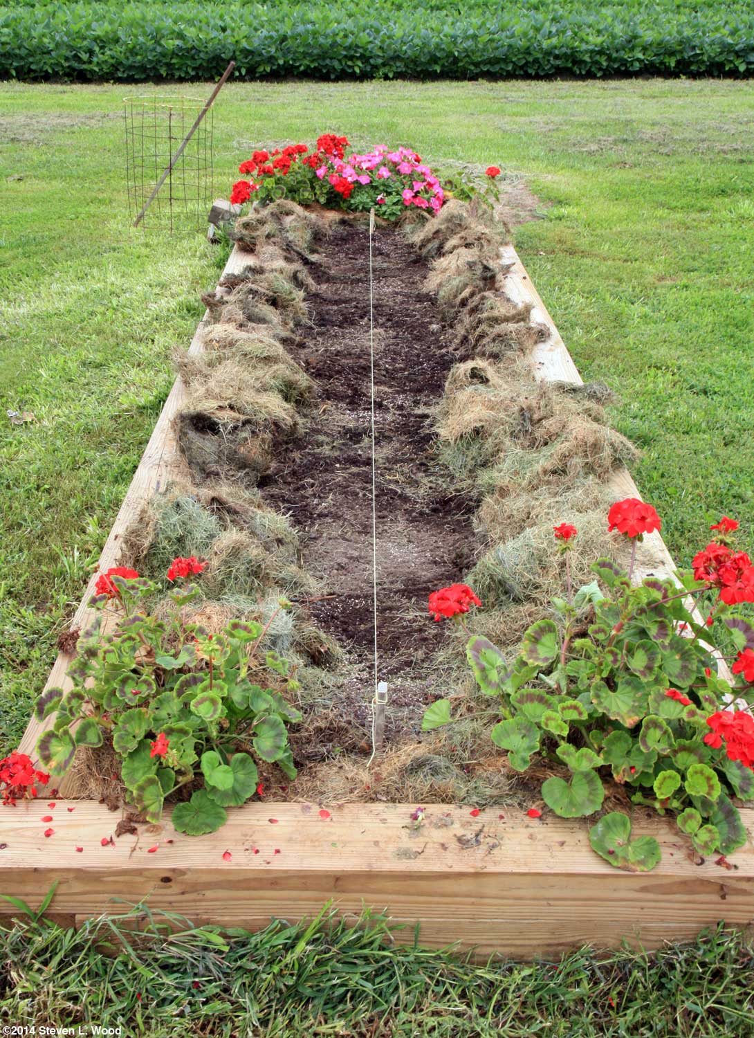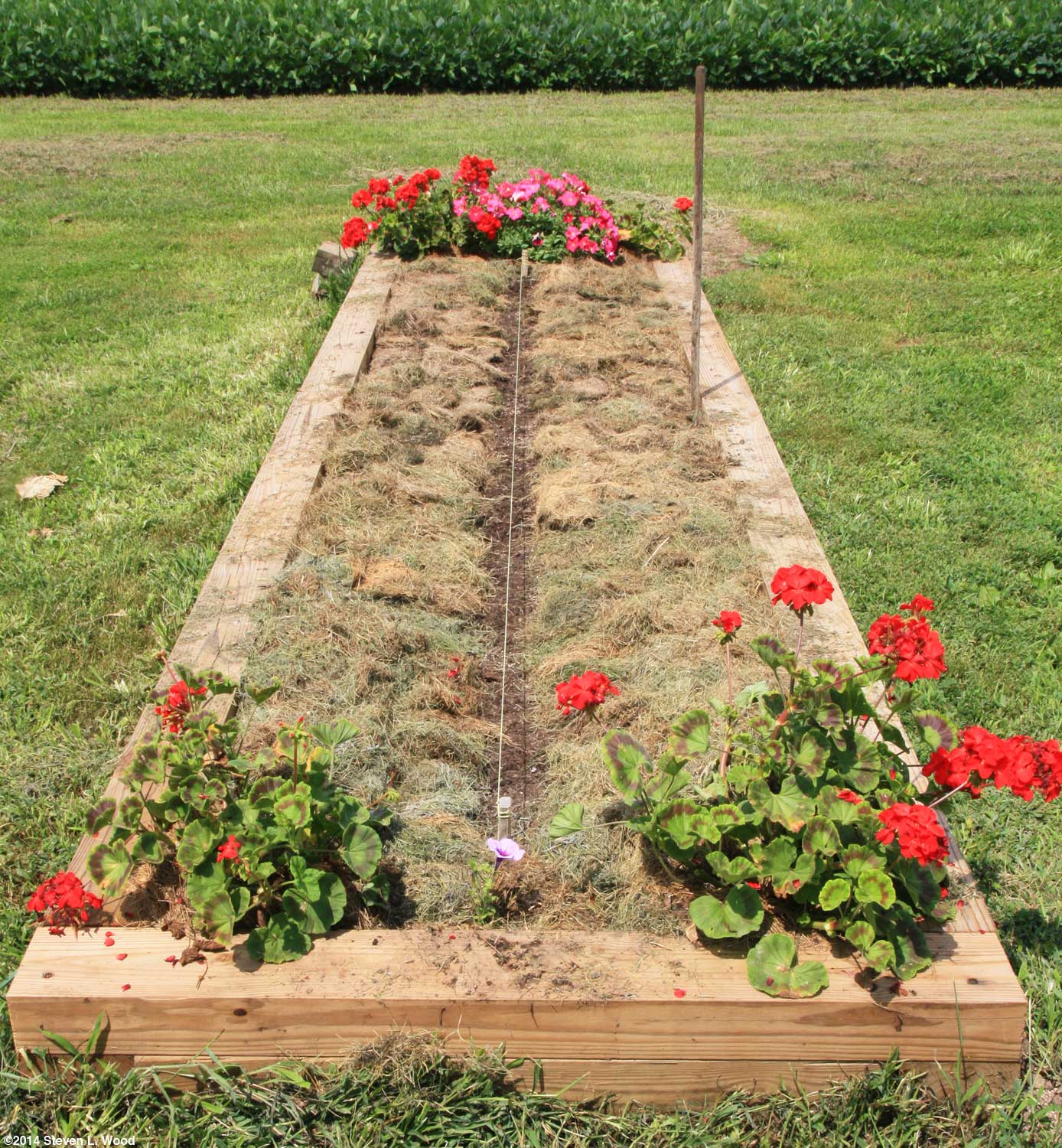 A light rain on June 8 popped up our slowly emerging sweet corn. As soon as I'd been able to "row the corn" (see where the row is from emerging plants), I'd started scuffle hoeing the patch. Wet weather the past two seasons had kept me from properly tilling our sweet corn patch, and weeds just about took over both years. I was determined not to let that happen again. The wooden stakes we initially use as row markers and to string the rows for opening a straight furrow get quickly replaced with far more attractive plants. One way I know the soil in our East Garden is improving is that it will now support geraniums, which used to die when transplanted into the plot.