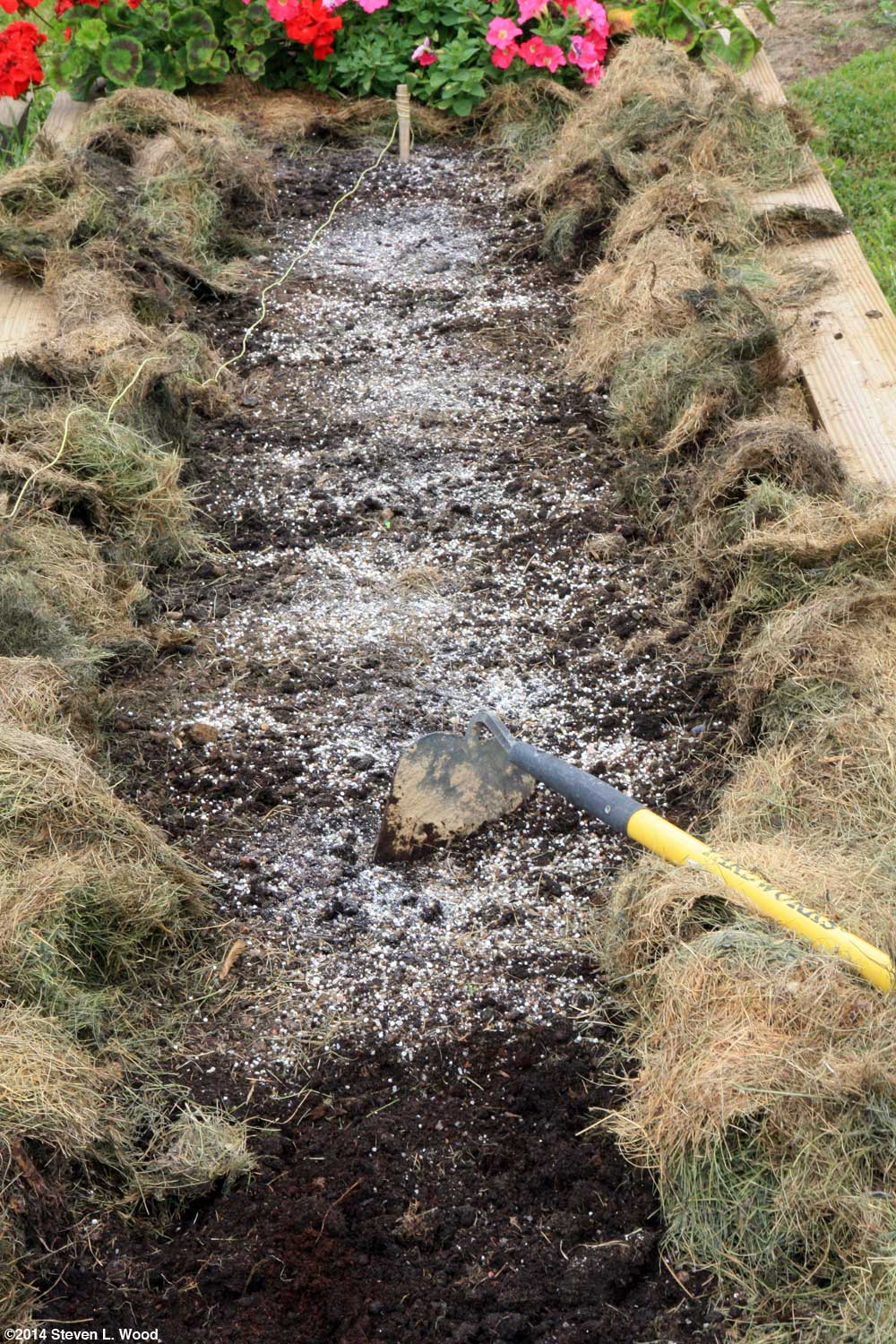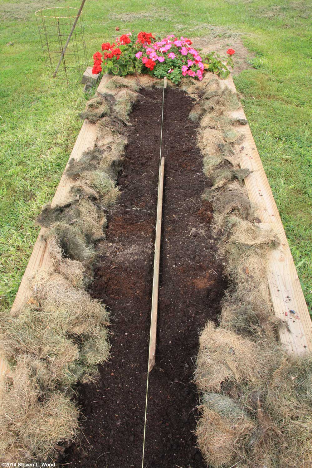 We only got a fair harvest of elephant and regular garlic. For cooking, though, there's nothing quite like the aroma and flavor of freshly dug garlic. I left three elephant garlic plants that had "bloomed" in the ground to later collect garlic bulbils from them. Coming off our worst garlic harvest in years, let me add that garlic is normally one of the easiest, most productive, and trouble free crops one can grow in their garden. For areas where the ground doesn't freeze too far down, one plants it in the late fall. For folks like my sister who lives in northern Minnesota, planting has to be done in the spring. Defying the wisdom of crop rotation, I planted our fall kale on July 18 in the same narrow raised bed our spring broccoli and cauliflower had grown in. I did do a pretty thorough bed renovation before direct seeding the kale. I pulled back the existing mulch in the bed with a rake and worked in a healthy dose of 12-12-12 fertilizer and some lime with my hoe. After raking the area smooth, I used a piece of one inch lumber to make a shallow furrow down the center of the bed and direct seeded three varieties of kale. I then scooted the old mulch up to the edge of the kale row.