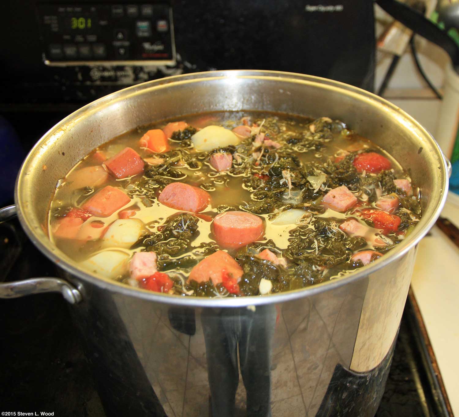 The Sugar Snap row did produce one interesting surprise. As they bloomed, some red pea blossoms began showing up amongst the white Sugar Snap pea blossoms. The red blossoms looked very much like Dwarf Gray Sugar blossoms, only they were on vines almost six feet tall, about twice the height of Dwarf Gray Sugars. Whether from stray seeds in the packet, a throwback, or a true mutation, the red blooms produced some nice photos for us. We celebrated National Kale Day on November 7 by making a big batch of Portuguese Kale Soup. The timing was actually more coincidence than planning, as the kale was ready to pick then. Sadly, after the heavy picking for the soup, the kale row only recovered enough for some boiled kale and kale chips.