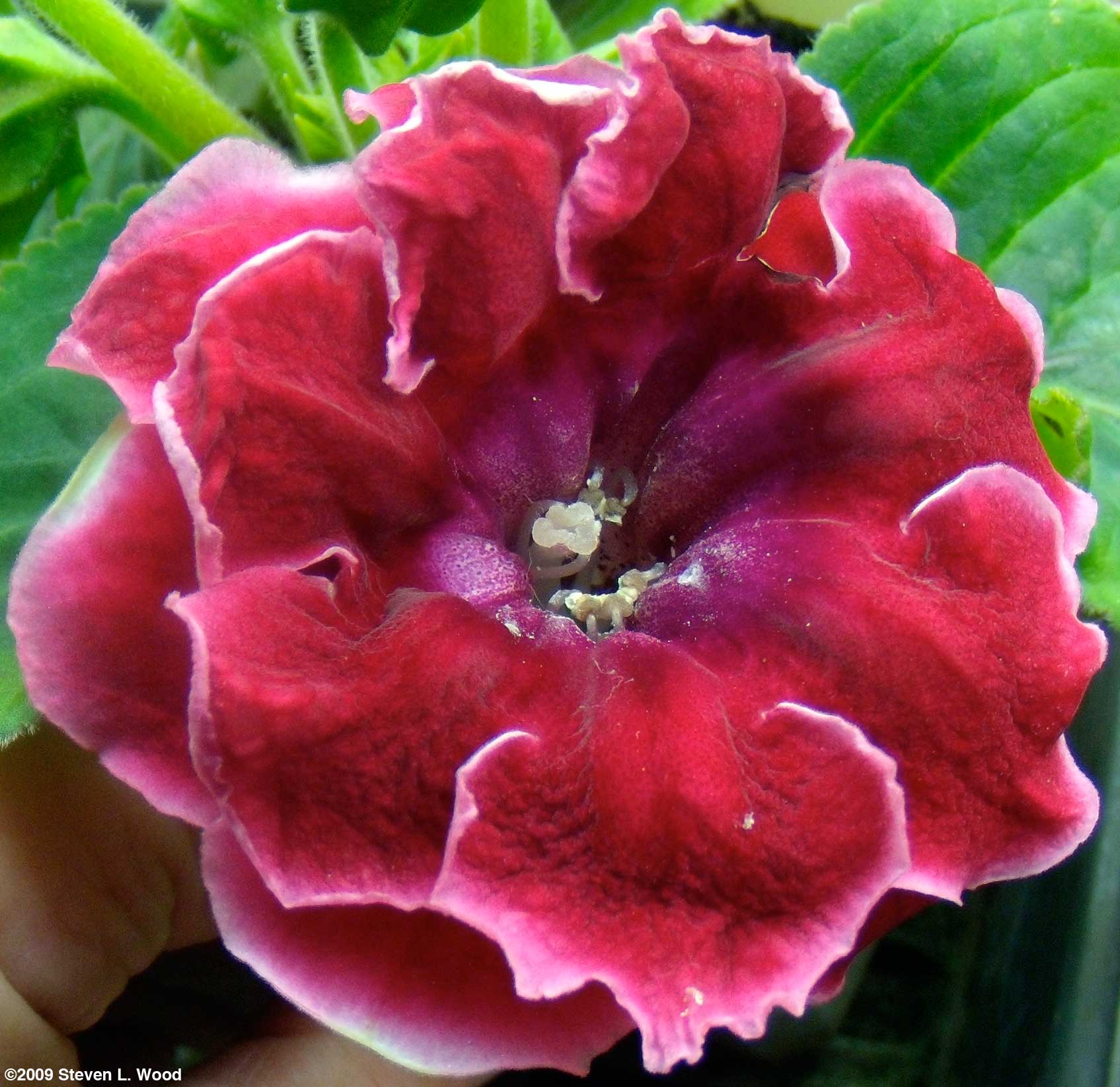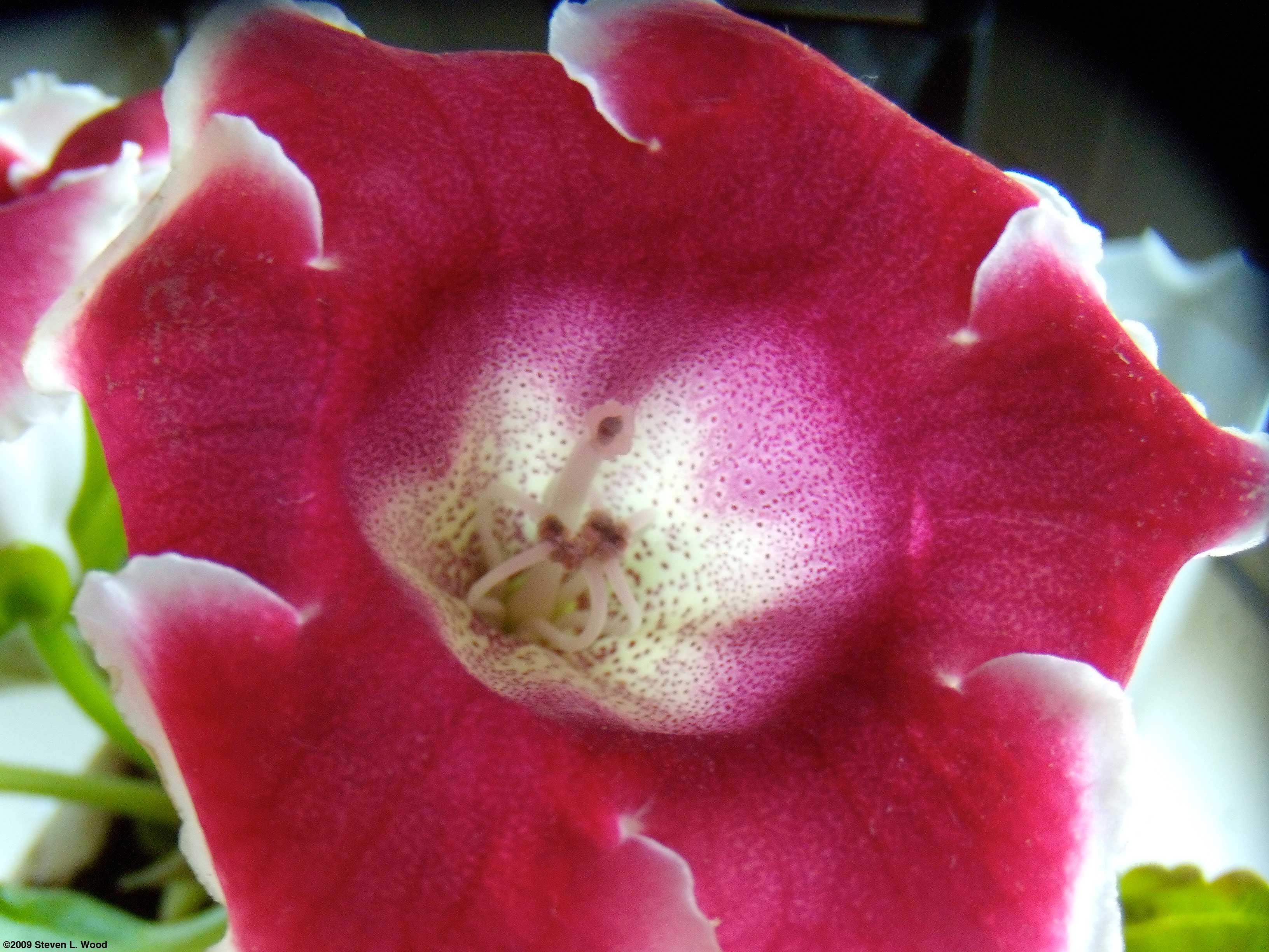 Possibly the best bloom shot I have of our gloxinias came from the rather pastel, white and red throated, open pollinated gloxinia shown above right and below. I was using the plant and bloom to illustrate hand pollinating technique for our Saving Gloxinia Seed feature story. You can see where I dribbled pollen across the flower petal. The shot is always a delight when it comes up in our rotation of Desktop Photos. Here are some more closeups of various gloxinia blooms.