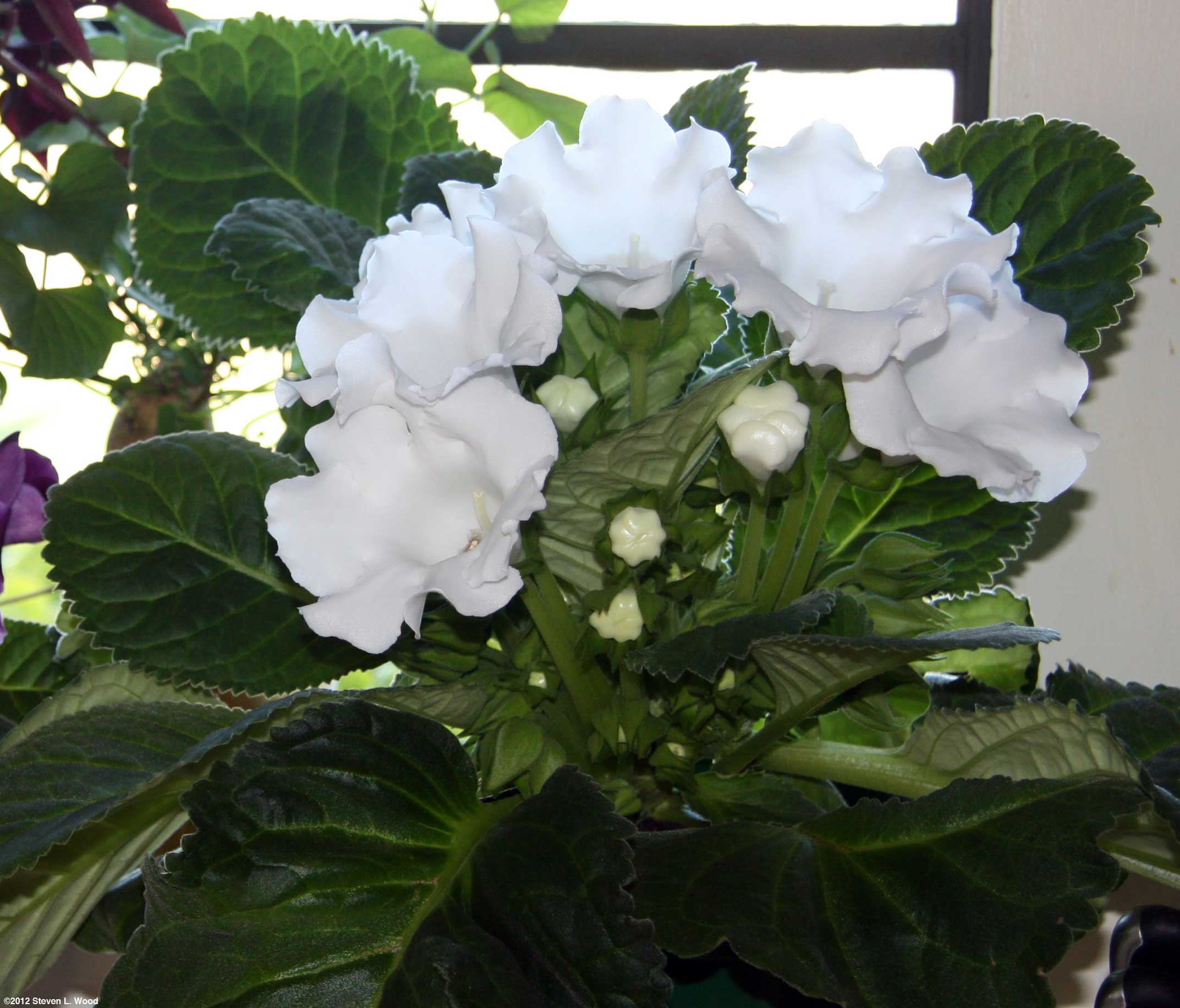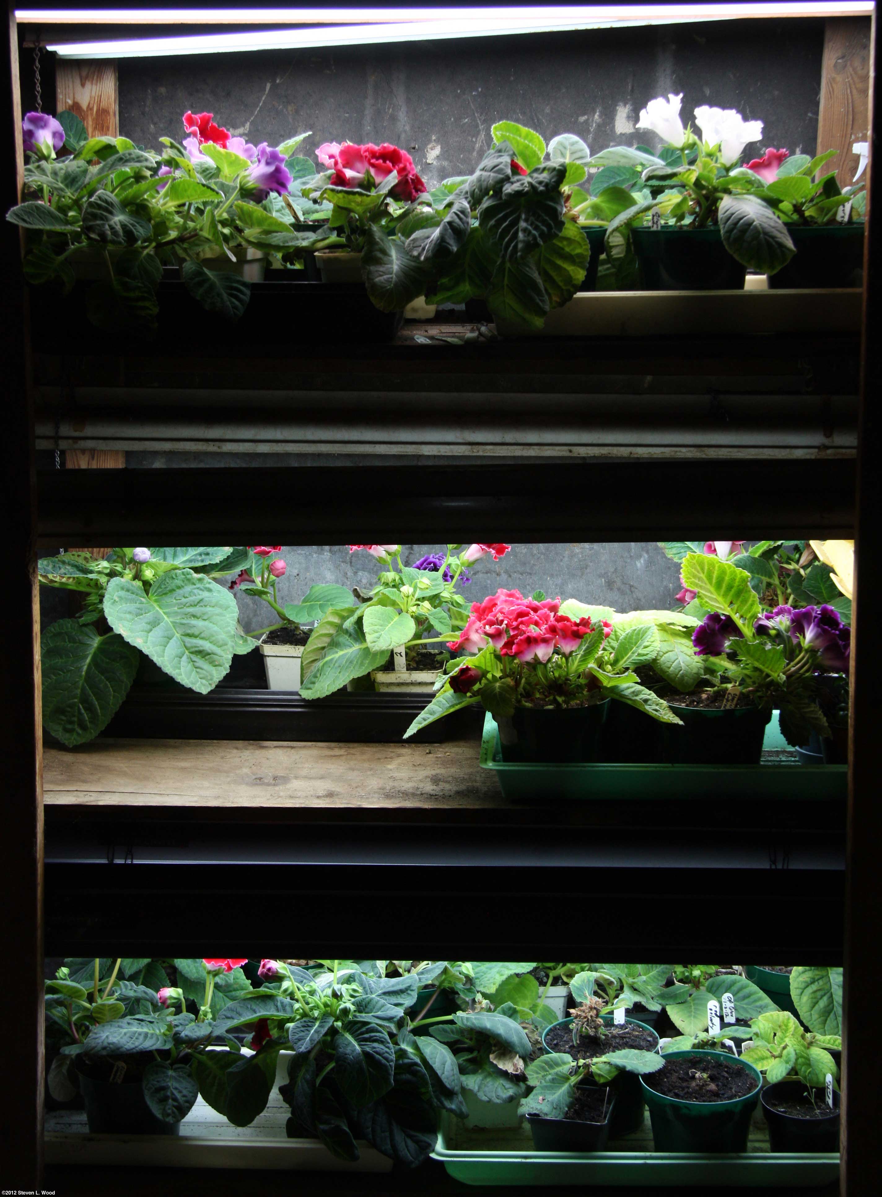 The white Empress gloxinia at the far right above carries a "superstar" notation on its plant tag. It's one of our older gloxinias that produces an incredible amount of blooms over a very long (months) period of time. While gloxinias from seed produce some nice blooms in their first year, it's after the second or third period of dormancy that the plants begin to produce massive amounts of blooms. The white superstar at one point carried 20 open blooms!