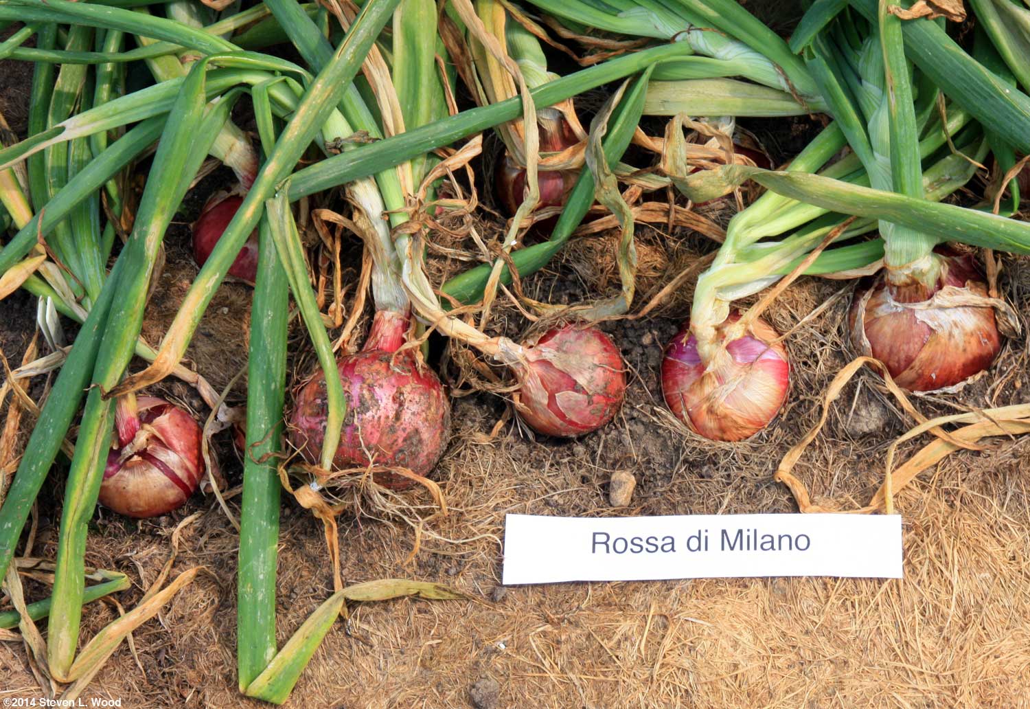 Red Zeppelin* - Two new hybrid red onion varieties were released somewhere around 2008. With the names "Red Zeppelin" and "Grateful Red," I had to try at least one of them. Red Zeppelin seed was cheaper then, so it was our choice. Our crop of the hybrid this year confirms why we've been growing them for so long. We got more large, good onions from them than almost any other variety grown, yellow or red. Hopefully, seed for the variety will remain available for some time. But if not, we now have three very good options for open pollinated replacements. Update: As usual, we had good Red Zeppelin onions in storage well into February, the best storage of any of our red onions. And sadly, seed for Red Zeppelins is no longer available. We tried some Red Sunset last year (2019) that both grew and stored well for us. I found some Red Zeppelin seed in 2022 from Hazzard's Seed Company! Rossa di Milano - Our short (3') double row of Rossa di Milano Note: We're still growing Rossa di Milanos in 2020!