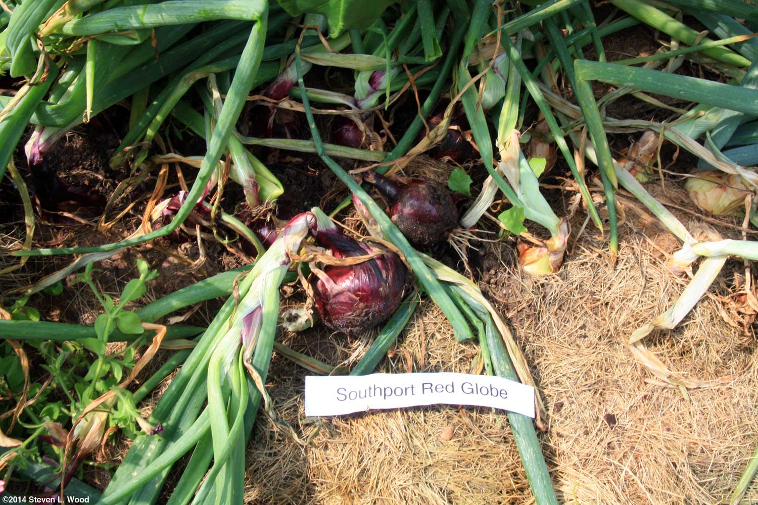 Southport Red Globe - Like our Copra onions, our short double row of Southport Red Globe onions, growing at the opposite end of the same row as the Copras, had to compete for light and moisture with surrounding plants. We lost a good many of our Southport transplants during the growing season, but those that survived produced the deepest, darkest reds of any of the red onions we grew this year. According to the variety description of Baker Creek Heirloom Seeds, Southport Red Globe onions were "first released in 1873." I suspect the variety won't disappear anytime soon from seed catalogs. Southport Red Globes are supposed to be a good storage variety that grows well in northern latitudes. We haven't cooked with any of them yet, but so far like what we've seen from them.