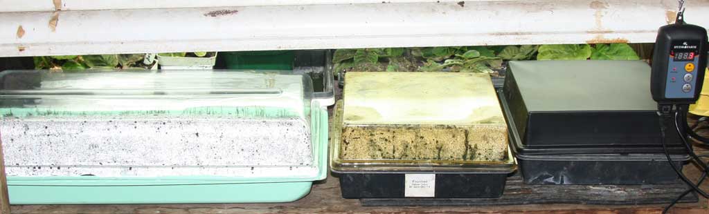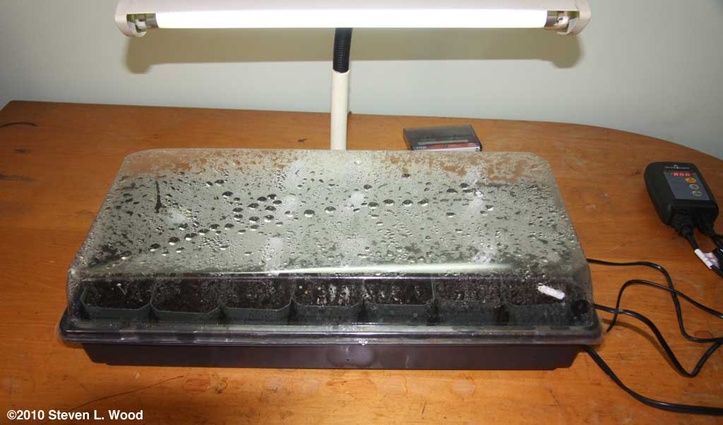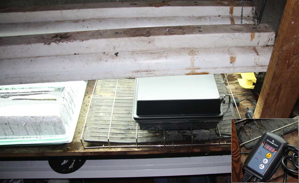 If you lack a dandy dark, warm closet or a great warm shelf, be sure to use some bottom heat or place your seed in a dark area that stays warm all day and night. A fancy heat mat and thermostat aren't really necessary unless you want to germinate in conditions like my cool basement!