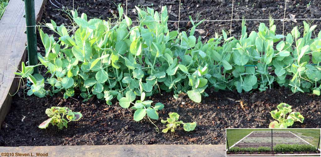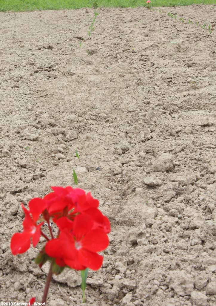 Earlier this week, I put in a whole row of geraniums in a narrow area next to our trellised, climbing peas. I like growing the taller pea varieties, as there's less bending involved in the picking. The geraniums will be shaded a bit by the peas, but the peas aren't season long and will be out by late June. Of course, I'll probably plant either pole beans or Japanese Long Pickling cucumbers (a fantastic, climbing, bread-and-butter pickle variety) there as a succession crop, which will again shade the geraniums later in the season. When I began the transplanting, I realized that we'd lost, or used up, an awful lot of the organic material in the 16"x15' row. I worked in a good bit of peat moss, a small handful of 12-12-12 fertilizer, and a heavy sprinkling of lime to loosen and enrich the heavy soil a bit.