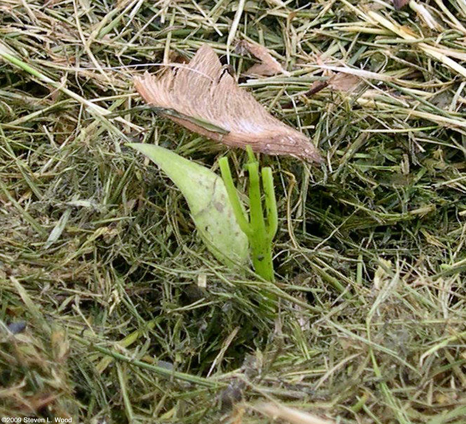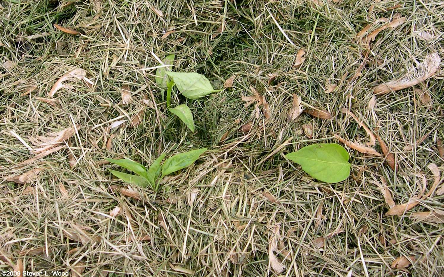Odds 'n' Ends While one might be tempted to just say "screw this," and spray ones soil with a pesticide such as Sevin to kill cutworms, I really hate using poisons on crops I'm going to eat, especially leaf crops. We're definitely not organic growers, but we try as best we can to avoid such stuff. But as I wrote about using diazanon above, I could hear Miss Piggy in my head going, "Who, Moi?" I still have about a pint of diazanon concentrate hidden away in my plant room. It's reserved for extreme situations, such as when fire ants built an eighteen inch high ant hill beside our then new asparagus patch. In twenty-four years on our current property, that was the only time I broke out the diazanon, and it proved quite effective in dispatching the ants. I had to hunt online for images to illustrate a cutworm and one of the moths that cause them. The black cutworm shown is from a public domain USGS photo. The a "dingy cutworm moth" is courtesy Andy Reago & Chrissy McClarren via Creative Commons licensing. Dingy cutworm moths, of course, create dingy cutworms. Sadly, I didn't have to go outside my own photo library to find images of cutworm damage. We had an unprotected row of pepper plants get decimated by cutworms in 2009. I suspect that our extensive use of grass clipping mulch allows the cutworms some safe harbor and is an inviting area for the moths to lay eggs.