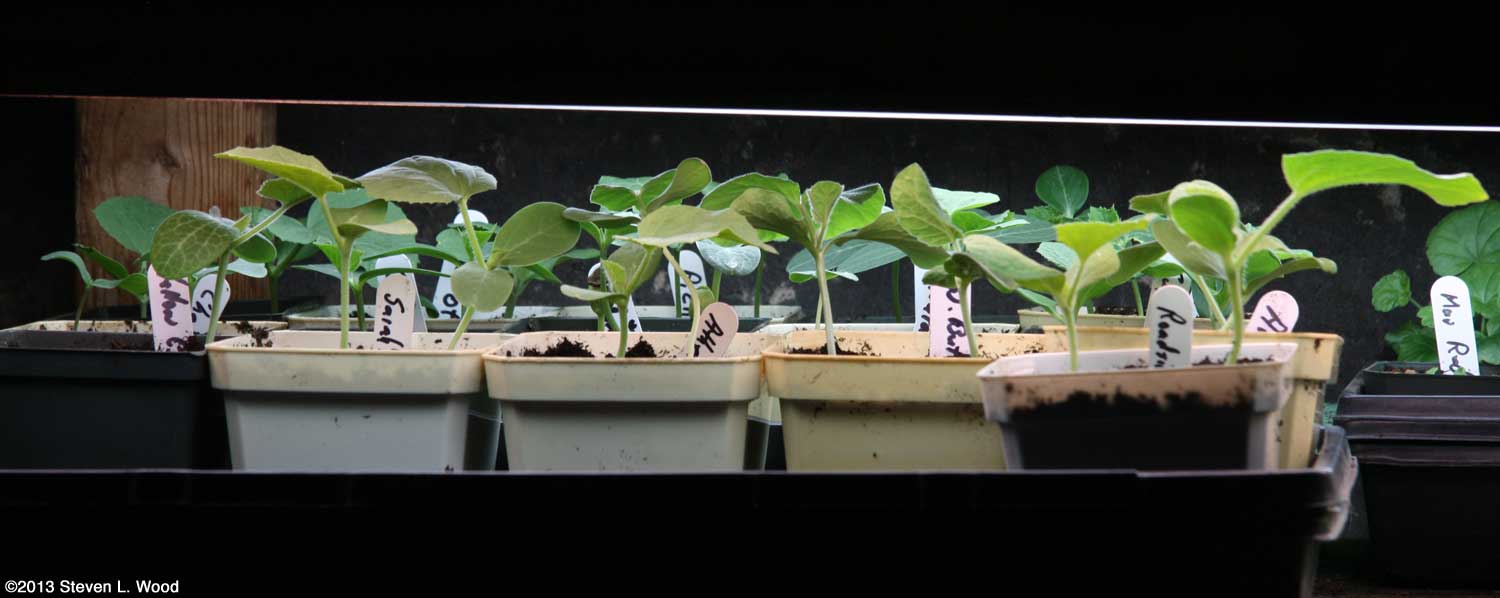 Brassicas or cole crops such as broccoli, brussels sprouts, cabbage, cauliflower, and kohlrabi need to be started fairly early. These crops grow well in the spring and early summer, but don't do well when the heat of summer sets in. Since they can withstand a mild frost, we often transplant them into our garden in early April from a late February seeding. You start broccoli and such just as you do tomato seed, lightly covering the seed in fourpacks or whatever container you have. Brassicas, however, don't really need any bottom heat to germinate. They'll usually come up well at room temperature. A Cornell growing guide gives a germinating temperature range of 45° F to 85° F. Our basement usually runs around 65° F when we're starting our brassicas. Watch young brassicas closely. Ours often get a bit tall and leggy, necessitating moving the plants lower in their planting medium, just as I described doing with leggy tomato plants. It's obviously better, though, to give them proper lighting and not have to repot them lower in the soil. We actually start brassicas twice each planting season, once in February and again in late June or early July for a fall crop. That sounds like a lot of broccoli and cauliflower, but it's amazing how fast you can go through gallon Ziploc bags of frozen broccoli and cauliflower florets if you really like homegrown broccoli, cauliflower, and carrots steamed with butter, garlic, a splash of lemon juice, and seasoned salt! See Growing Great Broccoli and Cauliflower for our way of growing brassicas both spring and fall. Melons