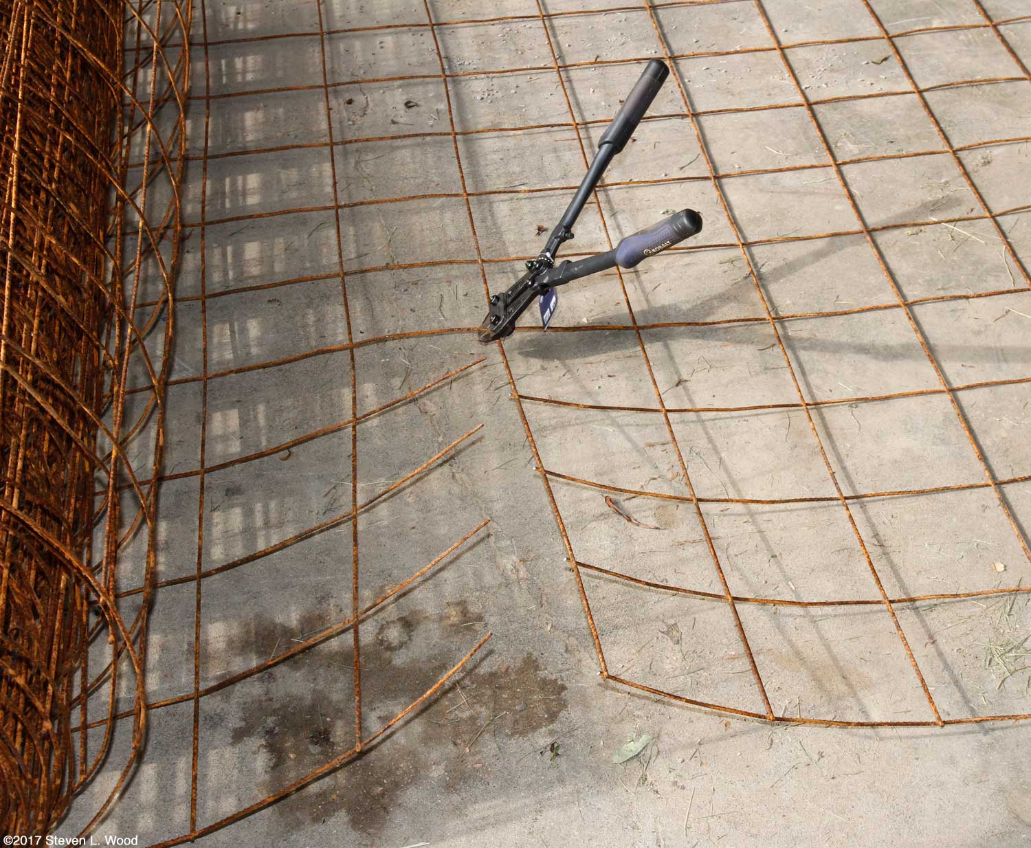 Years ago, I learned a way to make some outstanding tomato cages using welded wire concrete reinforcing mesh (remesh). The cages are tall enough that the tomato plants they support don't outgrow them until late in the season. After making my first bunch of them, I abandoned staking tomatoes or growing them on the ground, mulch, or plastic forever. This building of tomato cages will be my third in about fifty years of gardening, as the wire cages last a long time, but do eventually rust out. Welded wire reinforcing mesh isn't cheap, so ones initial investment in the cages is significant. A small roll of the welded wire that will build about eight tomato cages runs around $50. Since we're growing more tomato plants than usual this year, I bought a 5' x 150' roll of remesh to replace our now short and brittle old cages. Note that I haven't had to build welded wire tomato cages for about ten years. Building the cages is a pretty easy process. The wire grid is in six inch sections, which makes measuring it a snap. I roll out a section of the wire, holding the loose end of it down with something heavy, and cut off twelve sections of it with a set of bolt cutters. The last section is open to use to bind the cage closed. This yields a tomato cage about 21-22" in diameter, a perfect size for the semi-determinate tomato varieties we grow. After cutting the wire to length, I cut off the bottom strand of wire. That leaves five or six inch pointed wire spikes to anchor the tomato cage in the ground. Note that the roll of wire has a lot of tension, so one has to be careful when cutting the last wire that it doesn't snap up and cut you. (I just had my tetanus shot...a Medicare freebie for we seniors.)