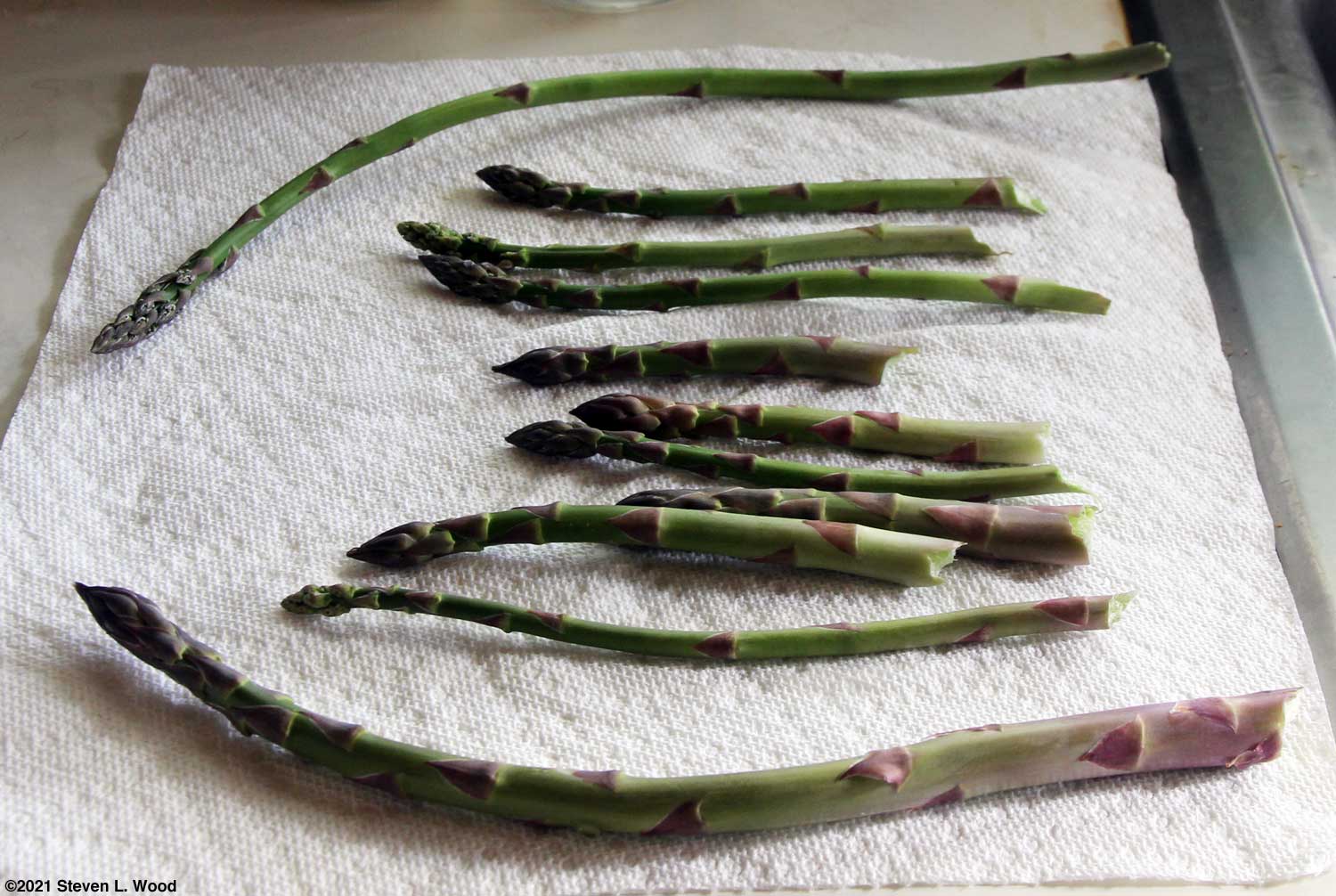 The next job was to carefully spread grass clipping mulch around our brassicas. I say carefully, as I had to leave some space around each broccoli, cauliflower, and Brussels sprouts and their cutworm collars so as not to create grass clipping ramps up to the plants. We've been enjoying steamed asparagus with our meals for over a week now. It's an early garden treat that lasts for about four or five weeks each spring. We built up so much of it that my wife took seven bunches of it to work with her last week for her co-workers. I'd skipped picking asparagus for a couple of days, so we got a nice picking today. Sadly, weeds are running rampant in our asparagus beds. For now, I'm pretty much just letting them go, as cultivating could damage emerging asparagus spears. When we stop picking and new shoots stop emerging, I'll weed, cultivate, fertilize, and spread compost around the asparagus plants. I started to thin our spinach this morning, but found myself a little overly optimistic about the plants' recent growth. I did wash and trim some of the thinnings, but our second annual early season treat, spinach salad, will have to wait a few days.