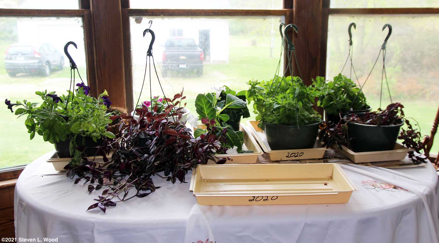I wanted to put up a double trellis around our peas today. But with steady 25 MPH winds gusting well into the thirties, trying to string a trellis would be a nightmare. Instead, on the advice from a high school friend, I hung a hummingbird feeder. The friend posted on Facebook that folks here in Indiana are seeing hummingbirds already. Our first hummingbird sighting last year came on April 20. While in the basement getting the feeder, I saw a gloxinia in our dormant area that had put on three or four inches of growth. Checking the rest of the pots, I found two more gloxinias breaking dormancy. So all three got repotted, watered, and moved under our plant lights. Saturday, April 10, 2021 - Trellis Day