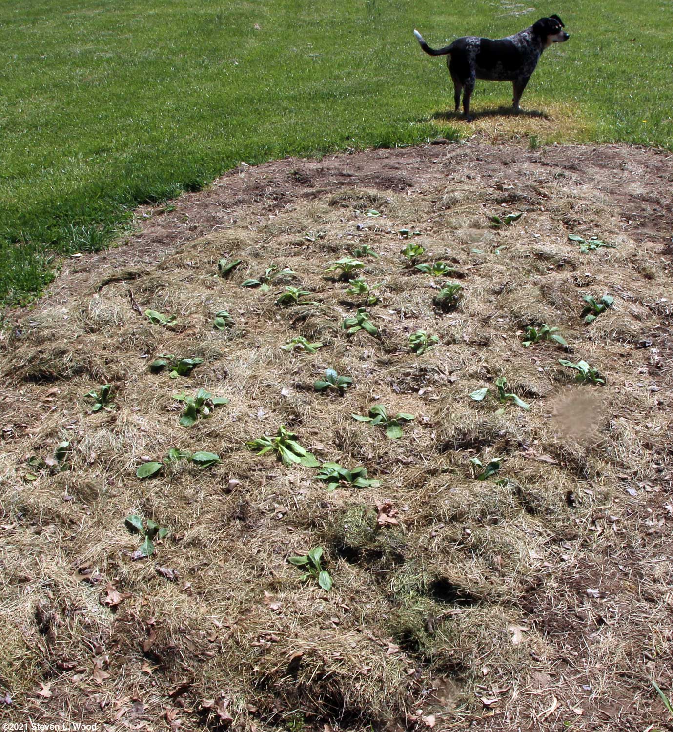 My next job was to sort out all the tall daisies under our cold frame. We've been trying to get daisies started in a spot at the back of our yard for several years. I have twelve Gloriosa and nearly a whole flat of Shasta daisies ready to go into the ground. Even though the area had been tilled twice so far this spring, I still wasn't happy with it. So I spread a little lime and 12-12-12 fertilizer over it and tilled it again this morning. It turns out that the third time was a charm. The soil worked up and raked out well. I clustered the taller Gloriosa daisies in the center of the area, surrounding them with the slightly shorter Shasta (Alaska) daisies. As I dug holes for the transplants, I often turned up old potting mix from previous plantings. The soil ranged from pretty good to heavy clay in various places. I watered each planting hole with some dilute Quick Start fertilizer with a little Serenade biofungicide (more about Serenade later). I mulched the planting as I went, putting in five or six plants and then mulching them with grass clippings.