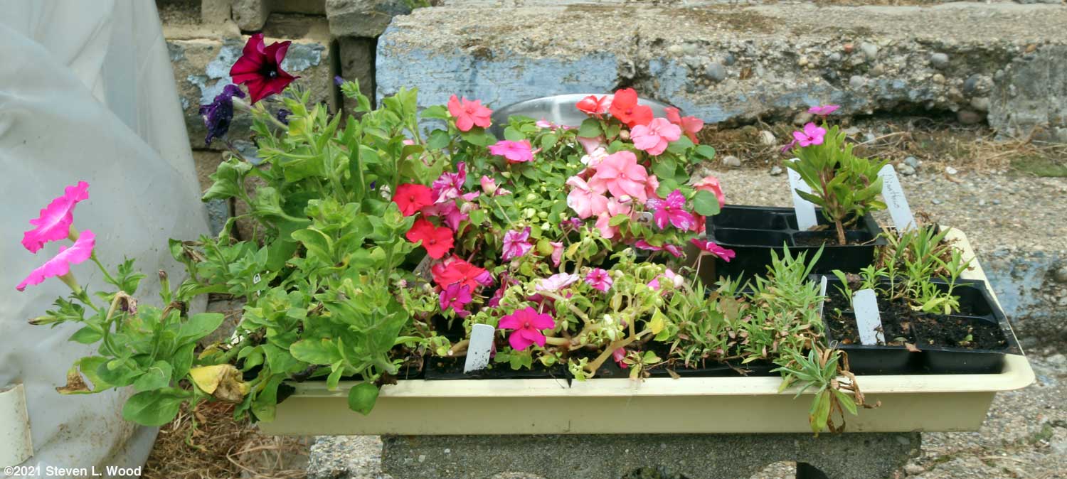 We also have dianthus, geraniums, and petunias in bloom. Our dianthus are all from saved seed, originally from the Carpet Snowfire variety. The petunias are the Celebrity variety which we've come to love for its diversity of bloom colors and styles. We had a vinca in bloom, but a heavy rain yesterday beat up its blooms.