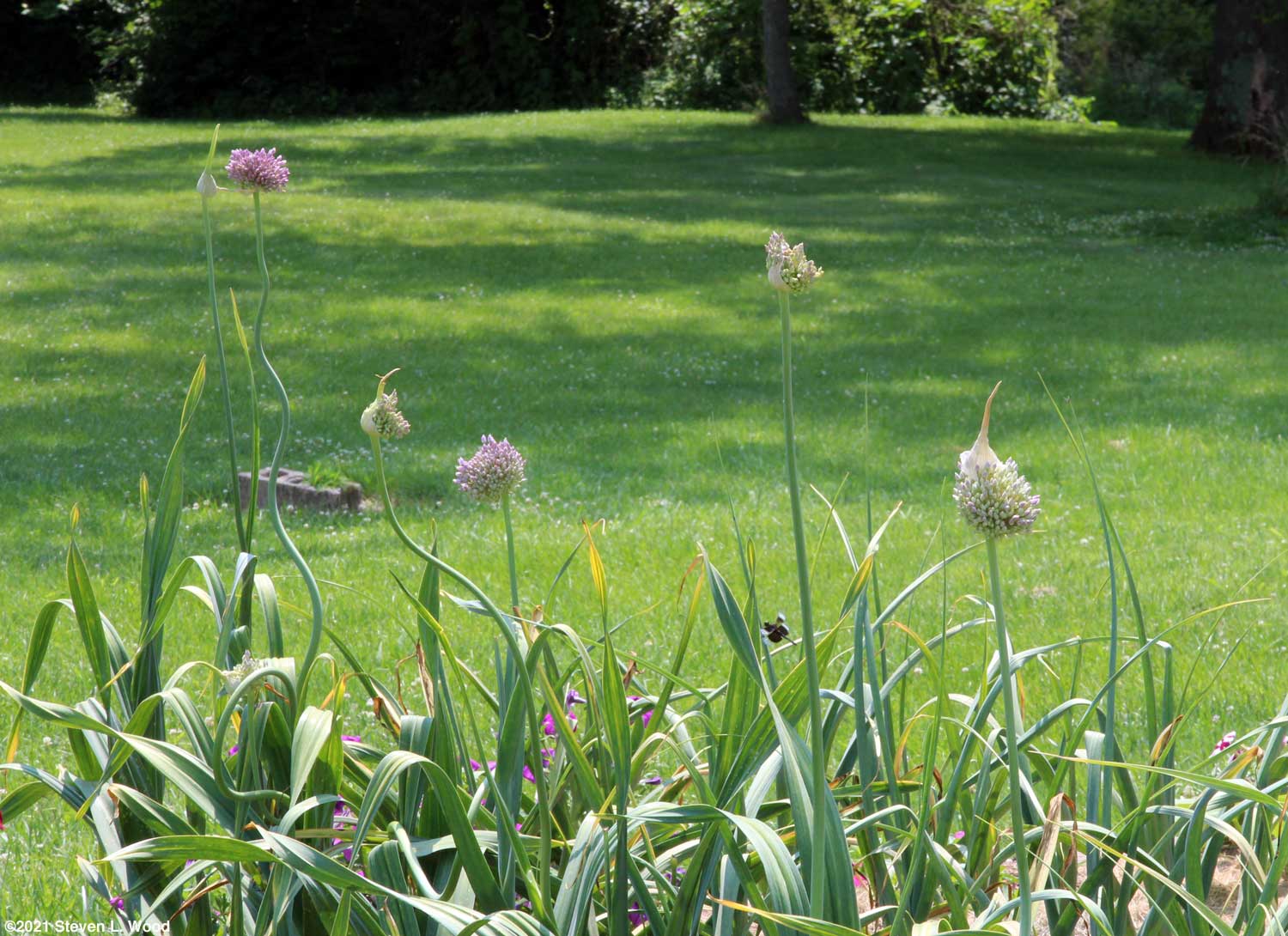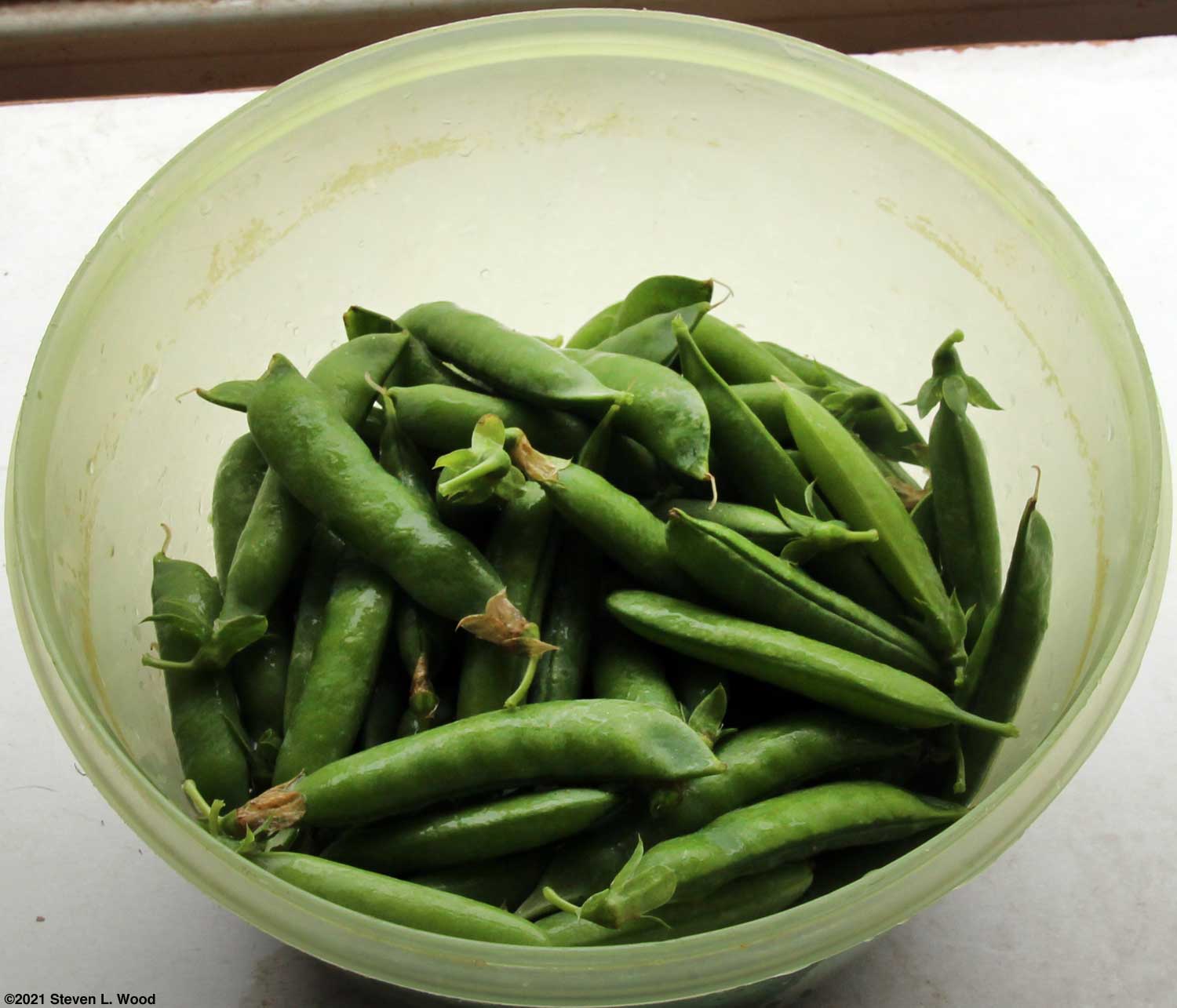I noticed yesterday that almost all of our elephant garlic plants and some of our hardneck garlic had put on rather rigid, central stalks known as a scapes. Scapes produce pretty blooms at their tops, although they don't pollinate, but vegetatively produce small bulbils that can be harvested and grown out to produce garlic bulbs...in two to three years. Scapes are also edible and store pretty well when bagged in the refrigerator. Bon apepétit's Christina Chaey relates 10 Things to Do With Garlic Scapes, the Best Veg You're Not Cooking Yet. I cut all but two of the scapes I could find, leaving the two to possibly produce their lovely "bloom" heads. The cut scapes got their bloom heads trimmed, stalks washed, and went into our fridge (in a green bag, of course). Later I chopped some and fried them with some round steak, giving it a bit of a flavor boost without an overwhelming flavor of garlic. We'll probably dig our garlic late this month or in early July. I noticed today that some of the garlic leaves are flashing (yellowing at the tips), a sign that they may need a boost of nitrogen for the home stretch. I share how we grow our garlic from planting to storage in Growing Garlic. Possibly far more helpful is the Boundary Garlic Farm by Henry Caron and Sonia Stairs. They've retired from the garlic business, but have kindly left their incredibly informative site online. Oh, and about those garlic blooms: They're gorgeous. Peas