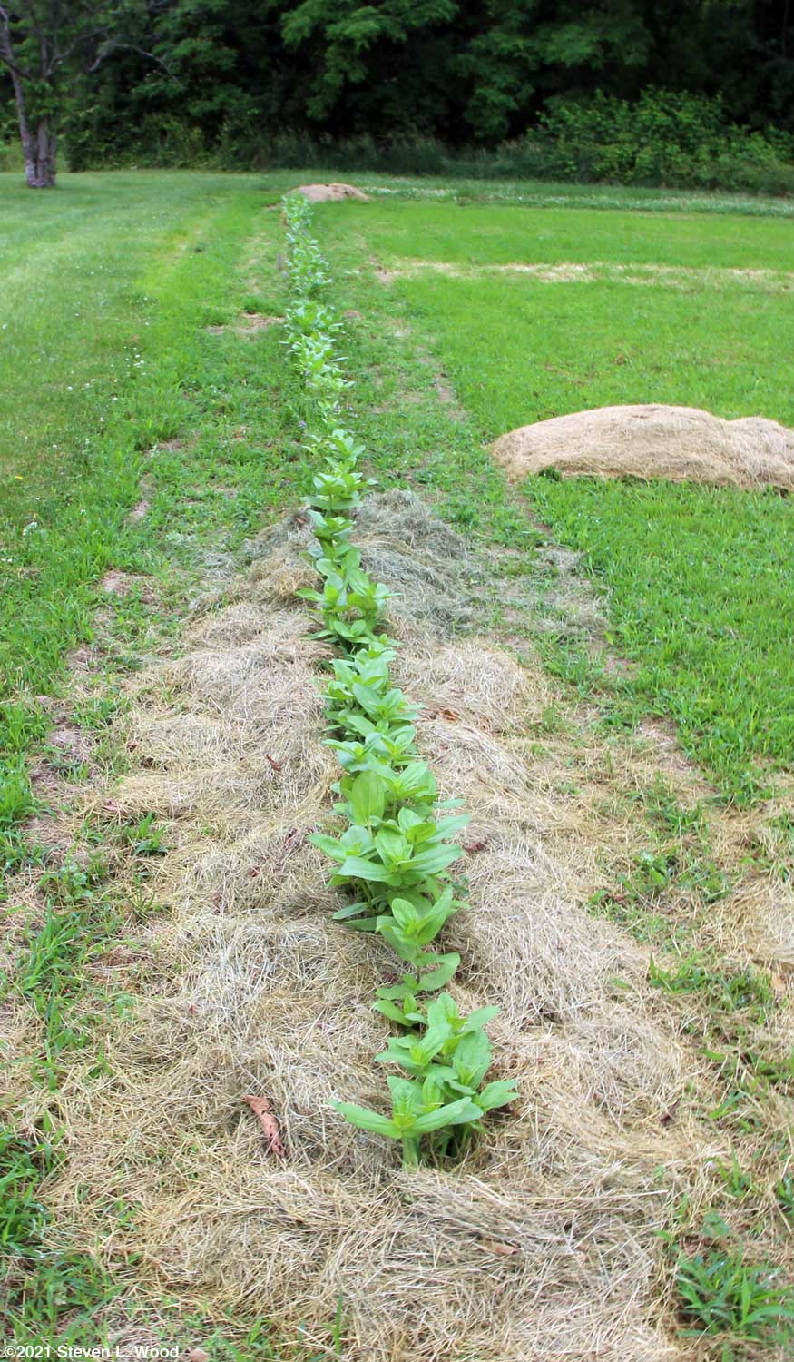 Knowing we might not get to till and then plant, I went ahead and sort of no-tilled our tomatoes and paprika peppers and some squash and melons. I first tried treating the rows for the plantings with a vinegar and Espom salts homemade weedkiller that had worked for me in the past. Sadly, I put it on too sparingly and the grass weeds just came back. So...I went ahead and gave each transplant a deluxe hole filled with peat moss and compost, a little fertilizer, some lime, and lots of ground egg shell to prevent blossom end rot in the tomatoes and peppers. Each planting hole also got lots of a liquid starter solution made up of Quick Start, Maxicrop Soluble Seaweed Powder, and Serenade biofungicide. A heavy 6-8 inch layer of grass clippings surrounded each plant to hold back weeds and retain soil moisture. Typically every job took longer than I thought it would. A lot of that was of my own making, as I chose to use compost that had to be screened from our finished compost pile. Mulching with grass clippings for weed control involved mowing (twice) and using our lawn sweeper to collect the grass clippings. I ended up using every tomato and pepper cage I had. Two of the tomato cages were in pretty bad shape from encounters with the lawn mower. Two or three years ago, we had twenty-three tomato cages. This year I found only seventeen of them. Apparently, someone helped themselves to some of our rather expensive homemade tomato cages we store in the corner of a field over the winter. But in addition to our six Earlirouge tomato plants in a raised bed, we now have Moira, Quinte, and Crimson Sprinter open pollinated tomatoes from which we hope to save seed. We also have Bradley, Bella Rosa, Dixie Red, Mountain Fresh Plus, and Mountain Merit in the row. Normally, I would have run the tomato/pepper row right down the middle of our East Garden. But we brought in anthracnose on some contaminated tomato seed two years ago when we had our tomatoes in a row down the middle. So I moved the row ten feet away from where the infected row had grown. I chose not to grow any bell peppers in our East Garden this year, instead going with a variety of paprika pepper varieties: Hungarian Spice; Boldog Hungarian Spice; and Sweet Paprika Pepper. I also omitted any grape tomatoes this year, even though I had some healthy transplants available. Our squash and melon row is still a work in progress. I have put in hills of Slick Pik yellow squash, Sugar Cube and Athena cantaloupe, Ali Babawatermelon, and a combined hill of some rather sick looking Blacktail Mountain, Crimson Sweet Virginia Select, and Kingman watermelon transplants. I still have more watermelon, honeydew, and squash to put in.