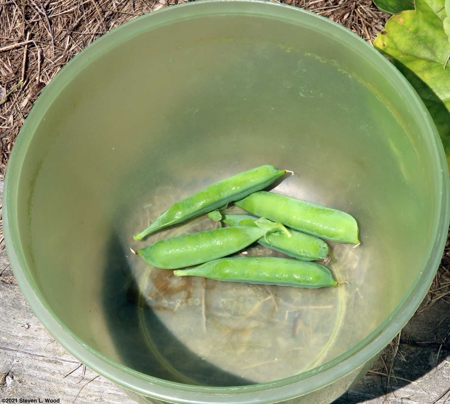 In between showers, actually, in a light mist, I picked a couple of pounds of peas. That may sound and look like a lot until you begin shelling the peas. An interesting web site I found shared the following information on converting peas in the pod to edible peas in weight and volume:
