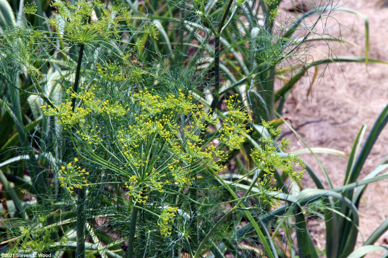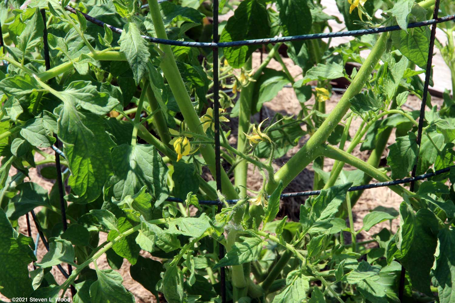 I did note that several of our tomato transplants didn't make it and will have to be replaced. A deer also had a collision with a pepper cage. The cage was knocked over, but the paprika pepper plant looked okay. The tilled, unmulched portions of the East Garden still have lots of clumps of grass showing. The 50' x 80' area I won't be planting this year is seeded to buckwheat which should begin to emerge in just a few days. I worked last evening and today clearing and cleaning up our previous planting of tall, early peas. That involved removing the vines and collecting any mature pea pods remaining for seed saving. Once I'd moved the vines to our compost pile, I hoed in some lime and fertilizer and raked the bed smooth. Since some of the pea vines had developed downy mildew, I gave the soil a good sprinkling of Serenade biofungicide. While our Japanese Long Pickling transplants are ready to go into the ground, I'm going to let the sun work on the bare soil for a couple of days before transplanting. I took some twist ties with me to the narrow bed and used them to tie up some snapdragons that had fallen over. The snaps should bloom profusely for a while until the cucumber vines begin to overgrow them. One other job in the cleanup was to pull and bag Abundant Bloomsdale spinach plants along the sunny side of the bed that had seed on them. I hung a paper sack of seed bearing spinach plants in the garage to dry for a few days. It's a fun time to just look over our garden plots. I probably left too many garlic scapes to "bloom," but they are pretty. Likewise, the dill at the edges of our main raised bed has pretty yellow blooms and gives off a pleasant fragrance when one is working in the garden. And one of our tomato plants has set tomatoes.