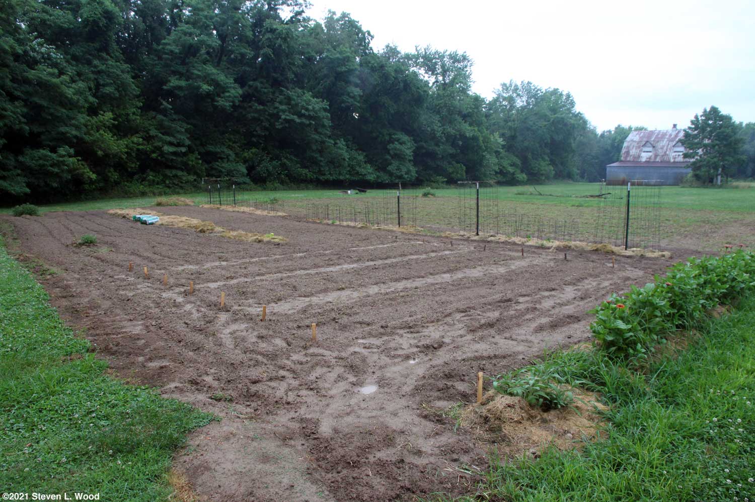 Since this planting is on the side of our East Garden that is shaded part of the morning, I'll need to keep a close eye on it to detect powdery mildew. I may apply a preventative spray or two of an organic fungicide. The location of the planting is well outside our East Garden proper, leaving plenty of room for the butternut vines to expand. Last year, I planted our butternuts and pumpkins in the East Garden. Each filled a 40' x 40' area with vines! With this late of a planting, our butternut varieties rated at 100 and 105 days-to-maturity (from a direct seeding) should just barely make a crop. It almost certainly won't be like last year's bumper harvest that allowed us to donate over 80 butternuts to our local food bank while saving a dozen or so for our use.